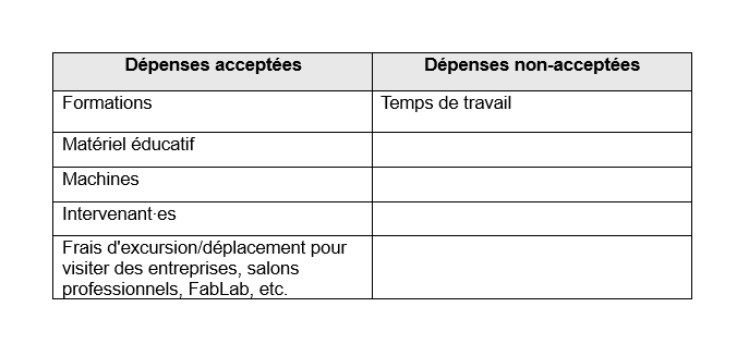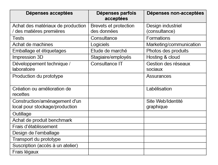 - Tu trouveras ci-dessous, une liste non exhaustive des dépenses qui peuvent être prises en charge dans le cadre du prototypage pour les (étudiant∙es) - entrepreneur∙es :