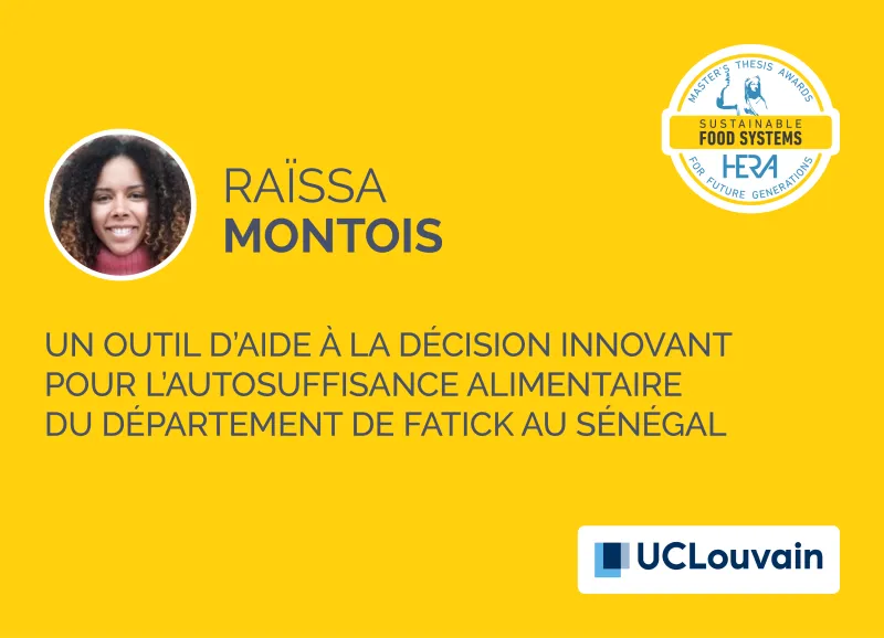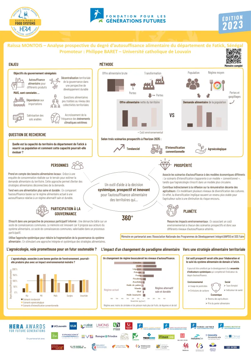 Le travail de Raïssa Montois a permis d’analyser, par une approche prospective et systémique, la capacité du département de Fatick (2646 km2), au Sénégal, à nourrir ses habitant·e·s à l’horizon 2035. Ce territoire est principalement menacé par la salinisation des sols et par des épisodes climatiques de plus en plus récurrents. Raïssa Montois a modélisé l’offre et la demande alimentaire du département selon trois scénarios prospectifs : tendanciel, agroécologique et d’intensification conventionnelle. Pour ce faire, elle a récolté des données, mené des entretiens sur place et réalisé une enquête quantitative sur le régime alimentaire local auprès d’un échantillon de ménages ruraux et urbains. Le modèle prend en compte des niveaux différents de salinisation, d’intensification agricole et de diversification des cultures. Conçu selon une approche participative, ce travail a abouti à un outil d’aide à la décision pour l’Association Nationale des Programmes de Développement Intégré et pour les collectivités locales, en partenariat avec SOS Faim.