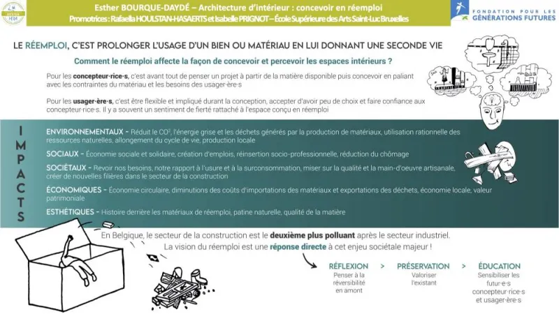 Le travail d’Esther Bourque-Daydé porte sur le réemploi dans le domaine de l’architecture intérieure. Loin de se limiter à une approche seulement orientée « matériau », il a pour originalité de porter un regard anthropologique sur ce secteur en plein essor de l’économie circulaire. Outre les apports théoriques, l’auteure a en effet longuement donné la parole à plusieurs concepteur·rice·s et usager·ère·s dont les témoignages mettent en évidence divers vécus relatifs au réemploi. Il en va ainsi, par exemple, des notions de fierté et d’appartenance liées à tout ce qui fait l’histoire et la charge émotionnelle des matériaux réutilisés (patine, chaleur, « âme », esthétique artisanale…). Le travail donne également des perspectives sur l’évolution du métier d’architecte d’intérieur (acquisition de nouvelles compétences, remodelage des réseaux professionnels, nouvelle chronologie des projets…) à l’aune du réemploi, de ses avantages et de ses limites.