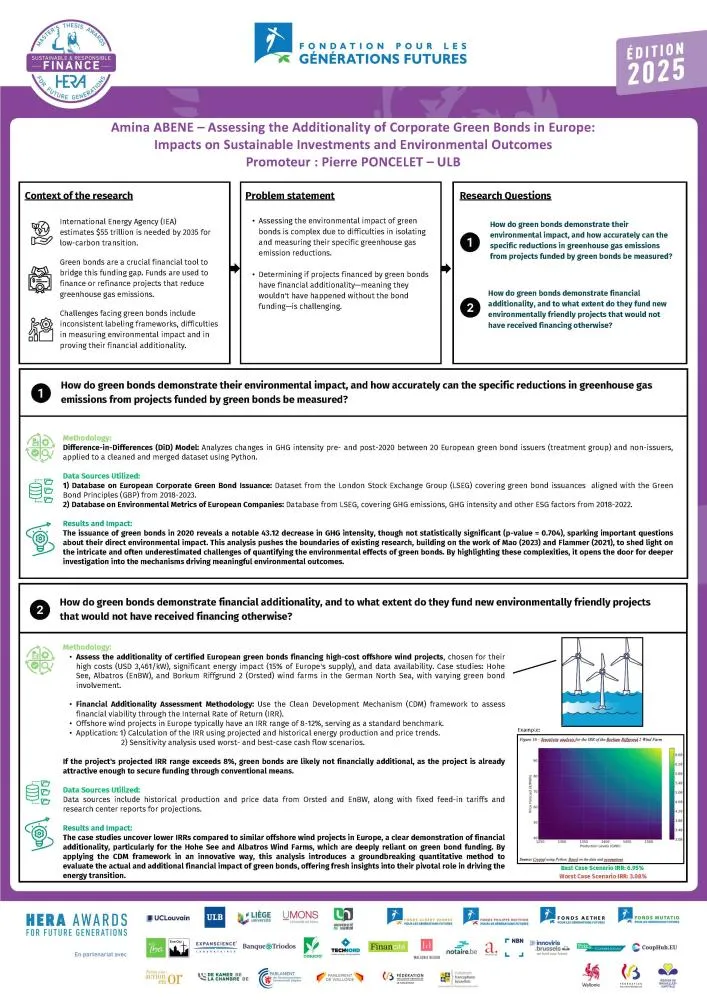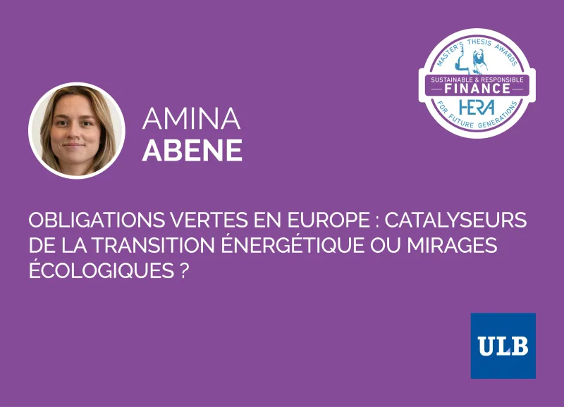Le jury félicite Amina Abene pour l’étude qu’elle a menée au sujet de l’efficacité des obligations vertes sur l’additionnalité financière et sur l’impact environnemental des entreprises en Europe. Il souligne le caractère très actuel de cette thématique, qui constitue un véritable enjeu de politique publique, sous-estimé et pourtant important à tous les points de vue. Cela permet d’initier ou financer des projets innovants pouvant être considérés comme pas rentables ou réalistes, ainsi que d’éviter le greenwashing.