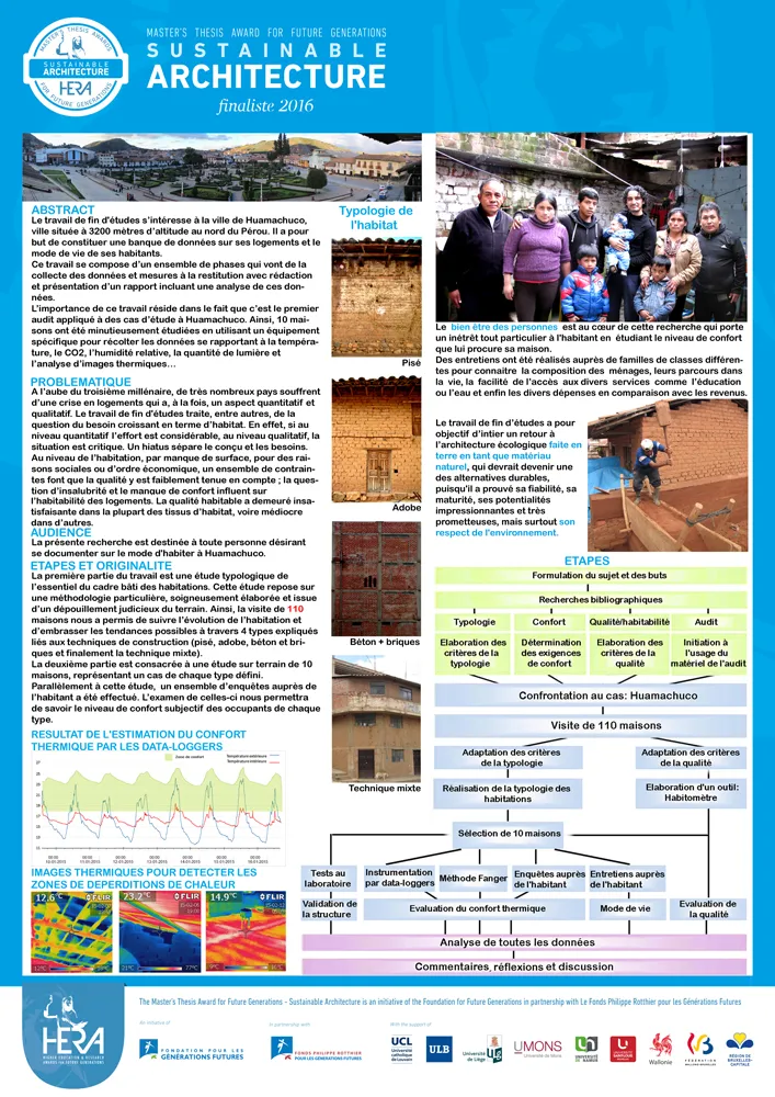 Huamachuco est une petite ville déshéritée du Pérou, située à 3.200 mètres d'altitude. Depuis une trentaine d'années, les maisons en matériau traditionnel (pisé, adobe) s'y font de plus en plus rares, au profit de la brique et du béton. Bien que plus cher et moins écologique, ce type de construction est privilégié par la population, à la recherche de lumière et d'espace. Cette évolution, très rapide, mène inévitablement à la disparition d'un patrimoine local de connaissances et de techniques ancestrales. Houmam Meliani a passé trois mois-et-demi à Huamachuco. Il a visité 110 maisons et dressé une typologie précise du cadre bâti de la ville. Il a longuement rencontré les habitants d'une dizaine de celles-ci et a récolté diverses données relatives à leur bien-être: température, CO2, humidité relative, quantité de lumière, etc. Son travail lui a permis de proposer un modèle architectural innovant, alliant matériaux traditionnels et techniques pilotes de mise en œuvre. Il plaide pour l'élaboration de codes et standards, gages d'une fierté renouvelée autour de cette culture architecturale.