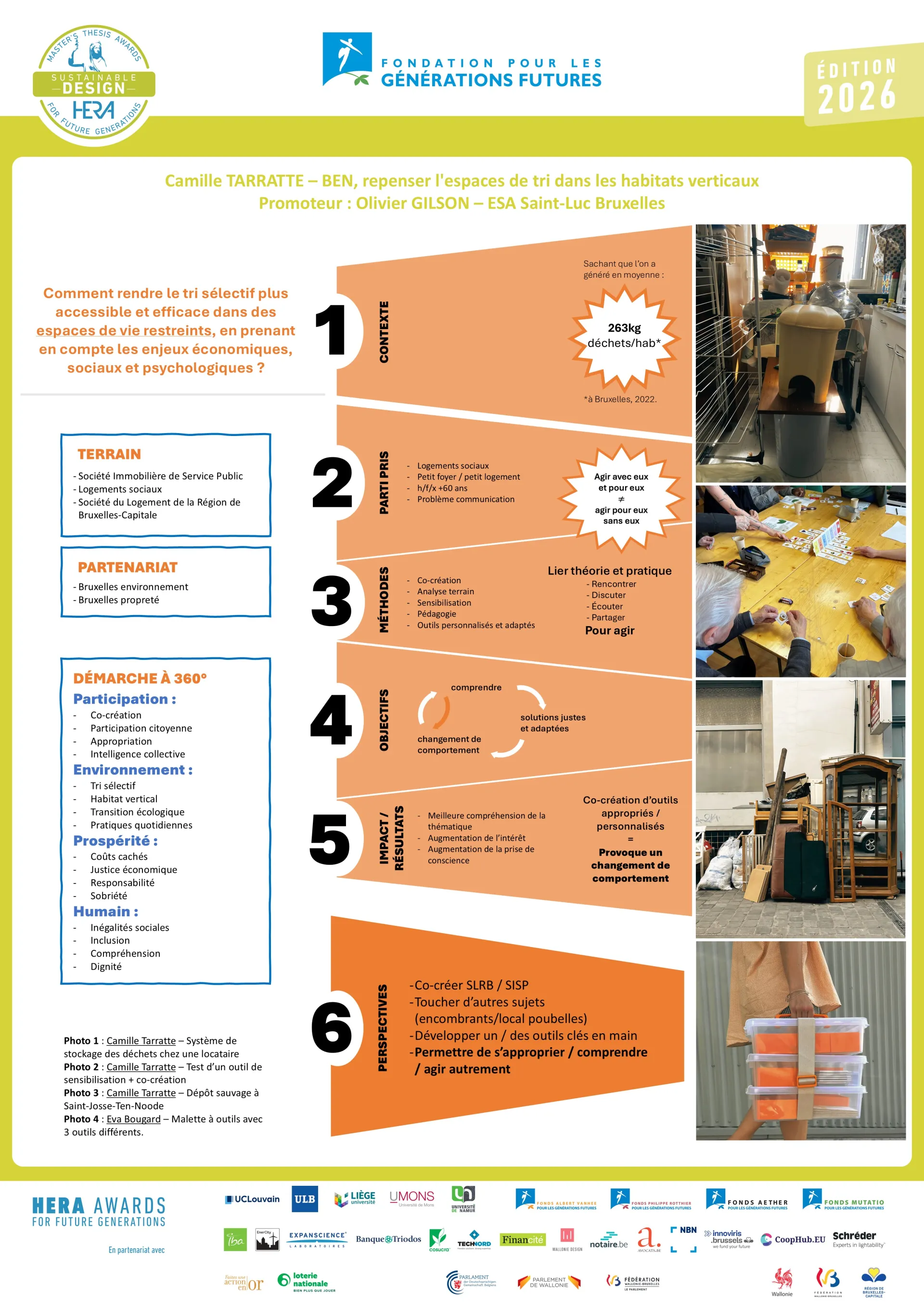 Camille Tarratte a cherché à rendre le tri des déchets plus accessible et efficace dans les logements verticaux et les espaces de vie restreints. Durant six mois, elle s’est immergée parmi les locataires, concierges et assistant·es sociaux·ales de la société de logement Foyer du Sud à Saint-Gilles et Forest, afin de comprendre les freins économiques, sociaux et psychologiques au tri sélectif et d’écouter les propositions et alternatives formulées par les principales personnes concernées. Tout en s’inspirant de méthodes de tri pratiquées en Allemagne, en Autriche et au Japon, elle a mis au point, avec les personnes précarisées, une boîte à outils permettant d’aborder le tri d’une façon plus vivante : à travers le jeu, la discussion, l’observation et la projection personnelle. Grâce à son immersion et au recours à la psychologie expérimentale, les outils de sensibilisation de Bruxelles-Environnement ont pu être affinés et des jeux coopératifs, susceptibles d’être utilisés dans toutes formes de logements verticaux, ont été conçus.