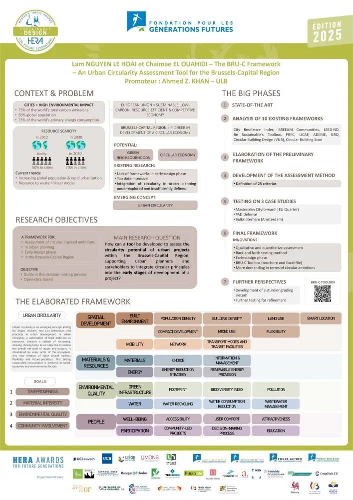Lam Nguyen Le Hoai et Chaimae El Ouahidi ont développé un outil destiné à évaluer, dès la conception, la circularité des plans urbains en Région de Bruxelles-Capitale : utilisation minimale des ressources, priorité de la réutilisation de matériaux sur la démolition, participation active des habitant·es, économie d’espace, promotion d’activités économiques dans le quartier, etc. Leur travail part du constat qu’à Bruxelles comme ailleurs, la circularité est beaucoup trop peu intégrée dans la planification urbaine. Elaboré à partir de dix outils d’évaluation de ce type déjà utilisés dans le monde, le BRU-C Framework – c’est le nom de cet outil – est basé sur quatre axes principaux : le développement spatial, les ressources & matériaux, la qualité de l’environnement et la population. Vouée à une utilisation aisée par les architectes, concepteur·ices et client·es, la boîte à outils contient un guide d’utilisation et un fichier Excel d’aide à la prise de décision. Il a été testé dans trois études de cas à Amsterdam et Bruxelles, ce qui a permis d’évaluer sa robustesse - à ce stade - sur le développement spatial et les ressources & matériaux.