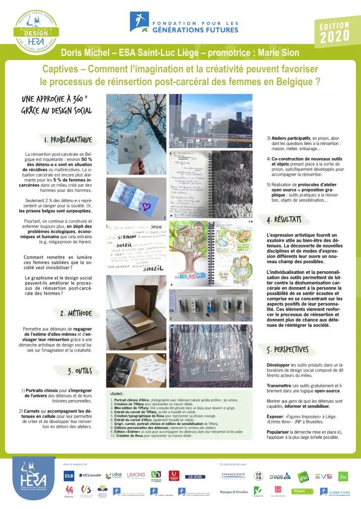 Le travail de Doris Michel repose sur un pari : l’art peut constituer une piste, parmi d’autres, pour la réinsertion socio-professionnelle d’ancien·ne·s détenu·e·s. L’auteure a réalisé un état des lieux détaillé du système pénitentiaire belge, du processus de réinsertion post-carcérale et de la pratique artistique en prison. Elle a ensuite mis sur pied, pendant un mois, trois ateliers graphiques (collage, collage et dessin, édition) avec cinq détenues de la prison de Lantin, avec l’objectif de renforcer leur confiance en soi et de les aider à se projeter dans la vie d’après la prison. Sur le plan méthodologique, Doris Michel s’est inspirée des méthodes d’innovation sociale comme le design social, soit un ensemble d’approches et d’outils élaborés en co-création avec le public concerné et destinés à faire émerger de nouvelles formes de citoyenneté. Cette méthodologie spécifique peut également s’appliquer dans les établissements pénitentiaires masculins ou de type Institutions publiques de protection de la jeunesse (IPPJ).