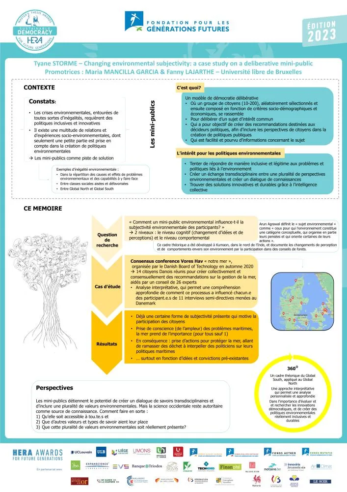 Tyane Storme a voulu savoir dans quelle mesure la participation à des processus de délibération citoyenne façonnait la subjectivité environnementale d’individus lambdas. Pour ce faire, elle a appliqué la grille de lecture définie par le politologue indo-américain Arun Agrawal à la conférence citoyenne sur le milieu marin organisée fin 2020 au Danemark par le Danish Board of Technology. Elle a mené des interviews semi-directives auprès de 8 des 14 citoyen·ne·s danois·es non-expert·e·s impliqué·e·s dans ce processus, de même qu’auprès de 2 de ses organisateur·rice·s. Son travail a permis de démontrer que ce genre de rencontre augmentait sensiblement tant la perception des problèmes relatifs à l’environnement marin par les participant·e·s que leur degré d’engagement, mais selon des intensités et des formes très variables. Il a aussi permis d’identifier les obstacles et les questions qui subsistent à propos de l’émergence d’une intelligence environnementale collective aboutissant, in fine, à des décisions réellement inclusives et originales.