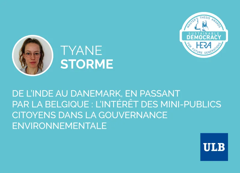 Le jury félicite Tyane Storme pour le travail original et ambitieux qu’elle a réalisé, au croisement des angles psychologiques et environnementaux, et sur un enjeu crucial qui mérite d’être encore étudié pour rétablir la confiance entre la population et les élites politiques. Le mémoire s’insère très bien dans la littérature existante sur les innovations démocratiques et se démarque notamment par le décentrement qu’elle propose, à travers le cas d’étude danois. Les principales forces du travail pointées par le jury sont : la portée des entretiens menés au Danemark, qui peuvent nourrir l’institutionnalisation de ces processus en Belgique ; la dimension didactique du mémoire, qui prend le lecteur par la main, grâce à un cadre théorique complet ; l’approche systémique adoptée (avec une attention importante accordée aux aspects sociaux, environnementaux et de gouvernance) ; le chapitre « Further Research » qui formule des questions stimulantes et ouvre la porte vers de nouvelles perspectives de recherche. L’étude pourrait cependant être enrichie en abordant les outils pratiques de démocratie participative. Unanimement enthousiaste, le jury suggère à Tyane d’essayer de publier son mémoire dans une revue scientifique.