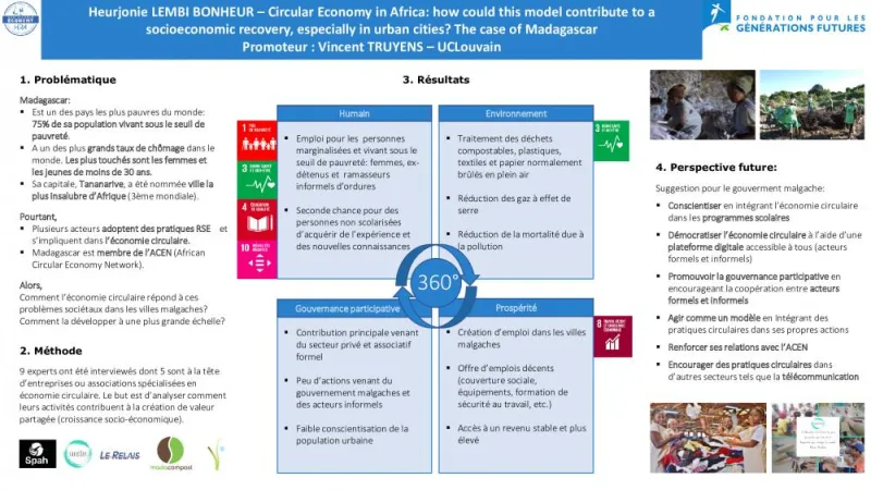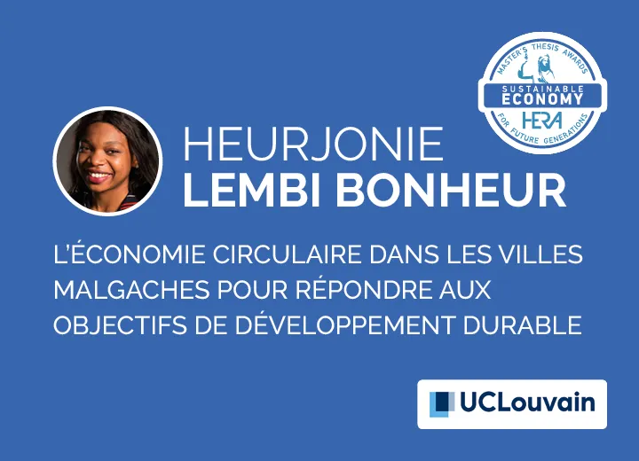 Heurjonie Lembi Bonheur a voulu savoir dans quelle mesure l’économie circulaire (EC), très peu connue à ce jour en Afrique, pourrait contribuer au redressement socio-économique des villes malgaches, confrontées à un chômage endémique élevé. Sur base de l’interview d’une dizaine d’acteurs associatifs et industriels, elle a d’abord analysé la perception locale de l’EC, constatant que celle-ci était souvent limitée à la sphère de la collecte et de la valorisation des déchets. Elle a ensuite démontré que plusieurs objectifs de développement durable (ODD) des Nations-Unies (amélioration de la santé et de l’éducation, réduction des inégalités, limitation de la pollution, etc.) pourraient bénéficier d’une approche circulaire élargie, incluant l’économie de la fonctionnalité, le cradle-to-cradle, la Blue Economy… Elle a enfin formulé une série de suggestions, parmi lesquelles la création d’une plateforme digitale riche en « success stories » ou l’adoption par les autorités de comportements circulaires dans leurs propres politiques d’achats.