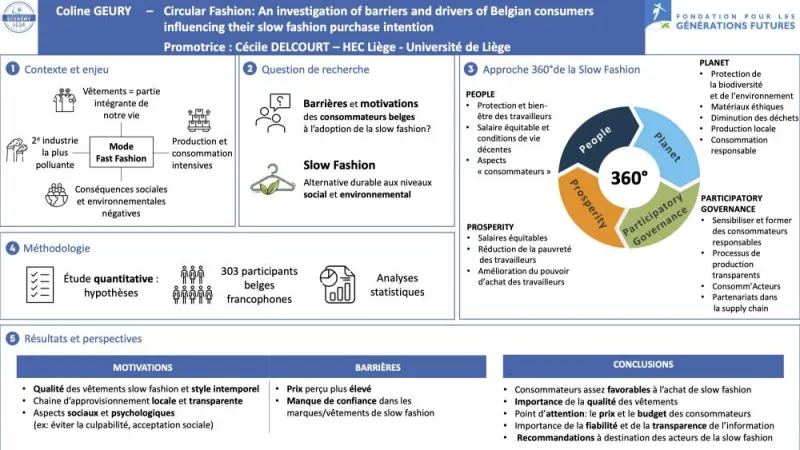 Le travail de Coline Geury se situe dans la sphère de l’économie circulaire et, plus particulièrement, dans celle de la slow fashion. Après avoir brossé l’état des lieux du secteur et de ses impacts sociaux et environnementaux au regard des Objectifs du Millénaire, Coline Geury a identifié tant les freins que les incitants, chez les consommateur·ice·s belges francophones, à une utilisation plus durable des vêtements. Sur base d’un questionnaire en ligne auquel 303 personnes ont répondu, elle a mis en évidence des constats qu’elle a ensuite déclinés en suggestions aux acteur·ice·s de la slow fashion. Par exemple : contre toute attente, l’intention d’avoir recours aux vêtements slow ne semble pas impactée par le degré de conscientisation sociale et environnementale des consommateur·ice·s, ni par leur désaccord avec la mode « rapide et jetable » ou leur volonté de singularisation vestimentaire. Celles et ceux-ci sont, en revanche, très soucieux·euses du caractère local des chaînes d’approvisionnement et de confection vestimentaire, et d’une grande transparence à ce sujet.