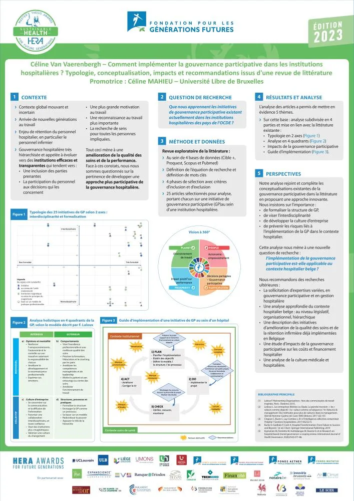 Céline Van Vaerenbergh propose une revue exploratoire de la littérature. Elle a analysé 25 initiatives de gouvernance participative mises en place dans les institutions hospitalières des pays de l’OCDE. Son objectif étant de s’en inspirer et de favoriser une meilleure implémentation de ce mode de gouvernance dans le monde hospitalier. À travers la nomination de ce travail, qui fournit des modèles théoriques inspirants, le jury souligne l’importance de ces nouveaux modes de gouvernance dans le monde hospitalier. Il invite de futur·e·s mémorant·e·s à se saisir de cette question, en approfondissant les conditions de mise en œuvre concrète et en intégrant la dimension économique : comment allier participation et utilisation efficace des ressources humaines ?