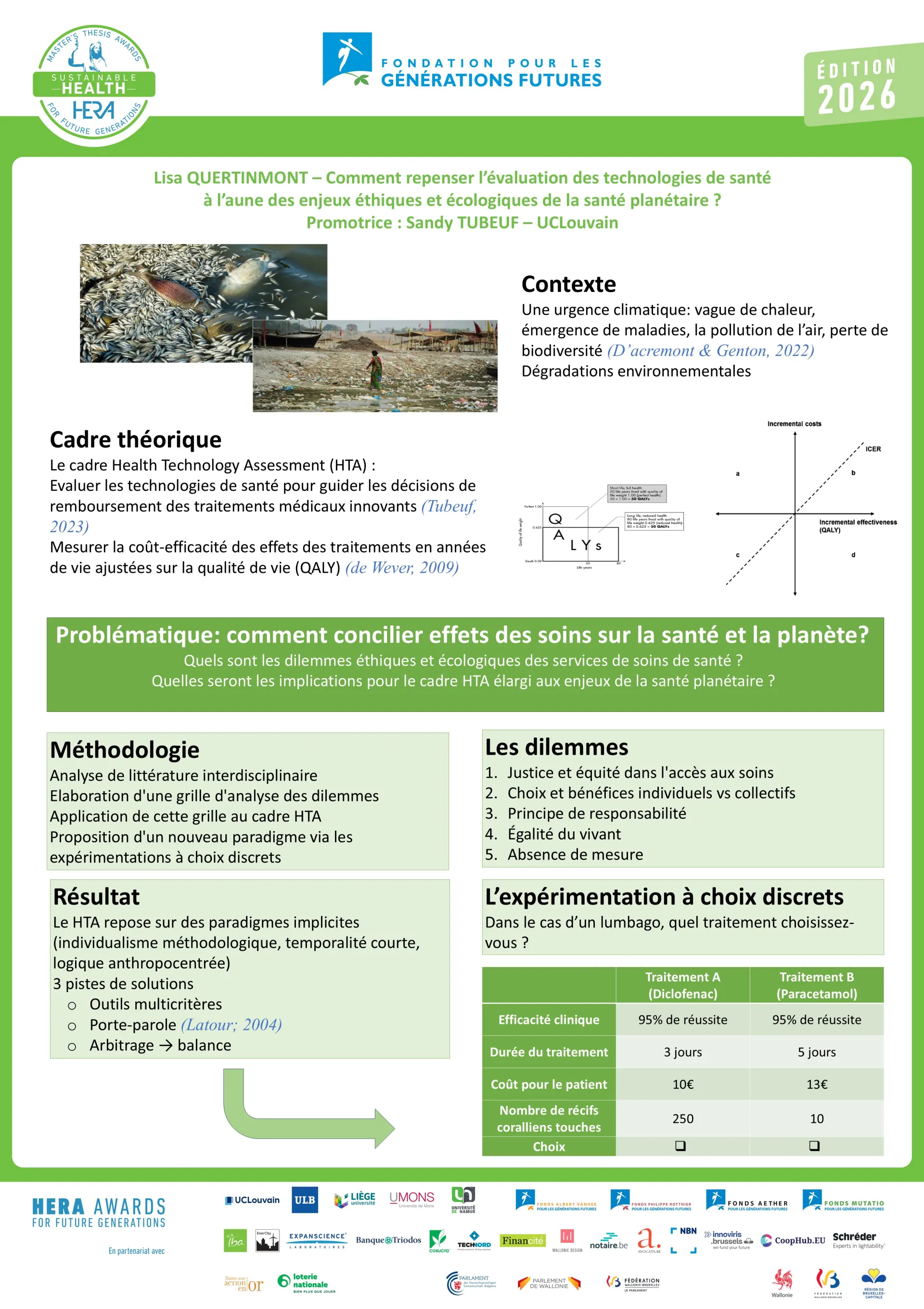 Le travail de Lisa Quertinmont investigue la possibilité d’introduire des critères environnementaux (empreinte carbone, érosion de biodiversité, prélèvement de ressources…) ainsi que des critères plus éthiques (justice intergénérationnelle, disparité Nord/Sud) dans les outils d’évaluation des traitements médicaux innovants. Sur la base d’une revue de littérature internationale, l’autrice a d’abord identifié 5 dilemmes révélant une tension entre exigences du soin et limites planétaires. Elle les a ensuite confrontés à l’outil Health Technology Assessment (HTA), connu pour évaluer efficacement mais uniquement les aspects cliniques et financiers des traitements médicaux. Une fois les angles morts du HTA identifiés (par exemple la non-représentation des générations futures ou l’absence de globalité), elle a élaboré des pistes de refonte du cadre général d’évaluation. Son travail plaide pour la transition d’un cadre fermé, économétrique et centré sur les expert·es vers un cadre plus ouvert, systémique et démocratique. Une proposition de design expérimental a également été avancée.