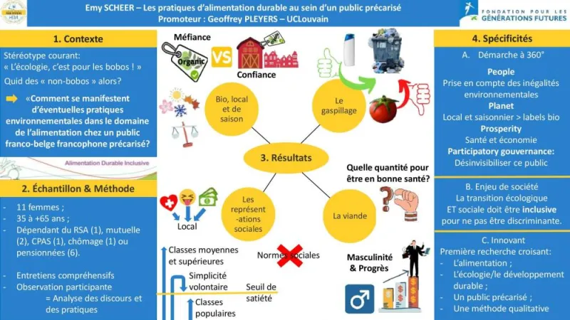 Le travail d’Emy Scheer s’intéresse aux pratiques et aux représentations des publics précarisés vis-à-vis de l’alimentation durable. Il prend racine dans un stage chez Espace Environnement asbl mené dans la foulée d’un projet européen d’éducation permanente (AD-In). Ce mémoire revisite trois grands aspects de l’alimentation durable (le bio, le local et de saison) de même que les thèmes du gaspillage et de la consommation de viande, mais avec l’originalité de se placer du point de vue d’un public précarisé, rarement considéré par les discours écologistes classiques. Menée par entretiens compréhensifs, cette étude a permis d’identifier l’existence effective de pratiques durables, bien que celles-ci soient généralement masquées par des discours plus pragmatiques et personnels (goût, santé, économie…). Plus largement, ce travail plaide en faveur d’une vision plus inclusive consistant à « dés-invisibiliser » le public précaire des discours sur l’alimentation durable et à le faire sortir du stéréotype de public « non éduqué » sur cette thématique.