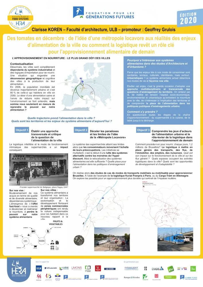 Ce travail concerne l’approvisionnement alimentaire des villes dans la perspective d’une population mondiale qui, à l’horizon 2050, sera à 80 % urbaine. Dans un premier temps, Clarisse Koren interroge les processus qui ont amené aux façons actuelles de consommer la nourriture. De là, elle s’intéresse aux impacts de cette consommation sur l’organisation des territoires urbains. Comment la nouvelle place accordée aux supermarchés a-t-elle transformé nos vies et nos villes ? L’éclairage porte à la fois sur les enjeux sociaux, culturels, territoriaux, identitaires et sanitaires. L’auteure développe ensuite une vision critique des revendications de changement émises par un nombre grandissant de citadin·e·s, demandeur·euse·s d’une alimentation plus locale, saine et durable. À travers divers exemples concrets empruntés aux réalités bruxelloise, parisienne et londonienne, un intérêt particulier est accordé à la logistique en tant que levier de changement.