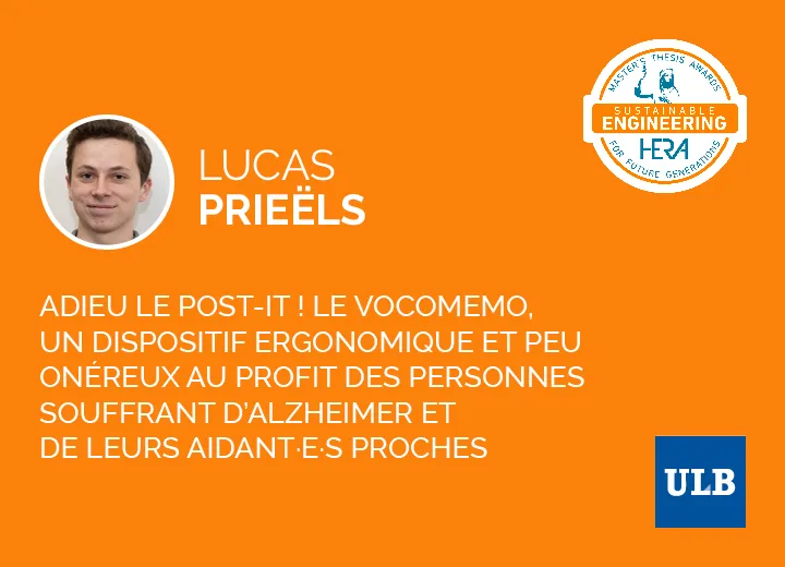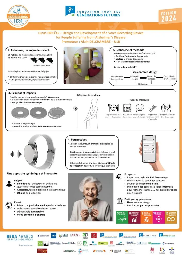 Avec trois étudiant·es issu·es de facultés différentes (programme TRIAXES+), Lucas Prieëls a mis au point un dispositif destiné à venir en aide aux personnes souffrant de la maladie d’Alzheimer à un stade précoce. Baptisé Vocomemo, celui-ci consiste en un petit enregistreur vocal porté en pendentif ou au poignet qui, grâce à la technologie Bluetooth, diffuse automatiquement des messages vocaux personnalisés selon l’heure de la journée et la localisation exacte de la personne concernée viades émetteurs disséminés ici et là dans son lieu de vie. Sa particularité est d’avoir été conçu, de A à Z, en fonction des avis et des observations de personnes malades et de leurs aidant·es (objectifs ergonomiques et financiers), et d’avoir respecté divers critères éthiques et environnementaux (consommation énergétique, choix des composants électroniques, lieu de production, etc.). Ce processus itératif a accouché d’un prototype électronique laissant entrevoir une commercialisation possible dans le futur.