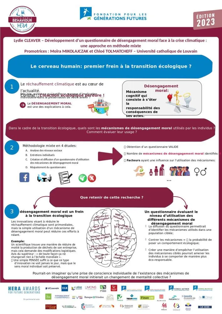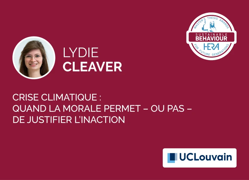 Le jury salue le mémoire de Lydie Cleaver qui propose un travail fouillé et nuancé, adoptant un point de vue original sur une problématique centrale lorsqu’on cherche à comprendre les mécanismes qui sous-tendent les comportements durables : le désengagement moral. En psychologie sociale et environnementale, si la notion d’engagement est souvent étudiée, celle de désengagement l’est moins. Le point de départ du mémoire est donc très judicieusement choisi et permet d’apporter un éclairage pertinent sur les actions à mener pour favoriser, dans un second temps, l’engagement moral en faveur de comportements durables. Ce mémoire démontre de manière puissante l’importance du facteur humain dans la transition écologique.
