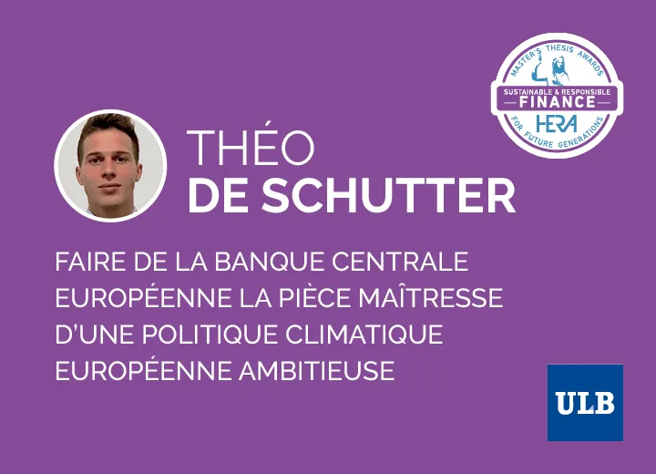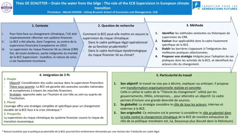 Théo De Schutter a tracé les contours d’une stratégie climatique pour la fonction prudentielle de la Banque centrale européenne (BCE). Son présupposé est que celle-ci pourrait garantir bien plus efficacement la prise en compte des risques financiers liés au dérèglement climatique (CRR) par les institutions placées sous son contrôle, et cela malgré les contraintes des traités. L’originalité de son travail est d’analyser l’intégralité des barrières à la supervision des CRR (comportementales, méthodologiques, techniques, politiques) en s’intégrant au cadre légal, politique, institutionnel et opérationnel dans lequel évolue la BCE. Le plan d’action structuré qui en résulte, général mais directement utilisable par celle-ci, est le fruit d’une consultation de la société civile, des organisations, de la classe politique mais aussi des banques elles-mêmes. Ce plan insiste notamment sur le rôle potentiel de « Joints supervisory teams », des équipes assurant journalièrement la supervision des CRR dans les institutions bancaires.