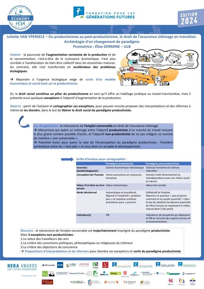 Le travail de Juliette Van Ypersele part du constat que, dans les économies matures, la poursuite de la croissance économique n'est plus corrélée à l'amélioration du bien-être collectif. Au contraire, cette croissance induit l’accélération des problèmes écologiques et sociaux. Dans ce contexte, elle a analysé dans quelle mesure le droit de l'assurance chômage est susceptible de devenir soutenable, c’est-à-dire non rivé à l’objectif de croissance économique. Elle a d’abord retracé les grandes étapes de l’émergence de la tension entre productivisme et post-productivisme. Elle a ensuite appliqué sa grille d’analyse à la réglementation de l’assurance chômage (plus particulièrement à la notion d’« emploi convenable ») et à son interprétation par l’ONEM et les juges du travail. Il en résulte que si le productivisme imprègne profondément le mécanisme de l’emploi convenable, des brèches non-productivistes subsistent malgré tout. Il appartient aux juristes et aux politiques d’en faire une interprétation novatrice et, ainsi, contribuer à la construction d’une société de post-croissance.