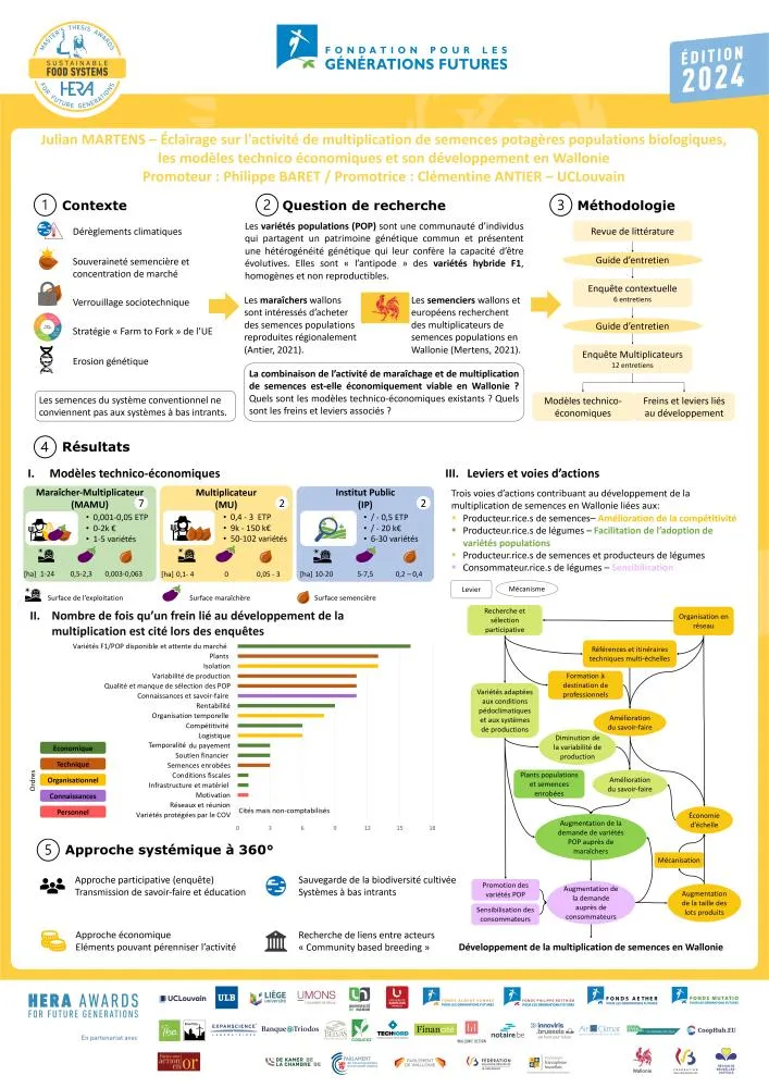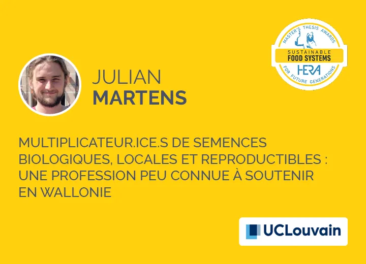 Le travail de Julian Martens porte sur le community based breeding, c’est-à-dire le système semencier de « semences populations », alternatif au système semencier industriel de type Hybrides F1. Il se concentre particulièrementsur les individus dont l’activité professionnelle, en Wallonie, consiste à multiplier les semences potagères populations pour les entreprises Cycle en Terre et Semailles. Après avoir analysé cette activité en lien avec le maraîchage et l’entreprise semencière, Julian Martens a identifié trois modèles technico-économiques de multiplicateur·rices (maraîcher·es multiplicateur·rices, multiplicateur·rices et institutions publiques) en fonction des motivations de leurs acteur·ices, du nombre d’équivalents temps plein, de la superficie et du nombre de variétés cultivées, du chiffre d’affaires, etc. Il a mis en évidence différents freins (techniques, financiers, organisationnels...) à l’essor de cette filière et proposé diverses améliorations dans le contexte d’une transition vers un système agroécologique biodiversifié durable et équitable.