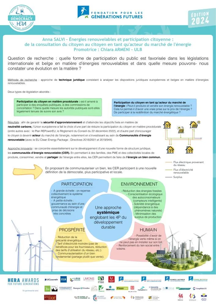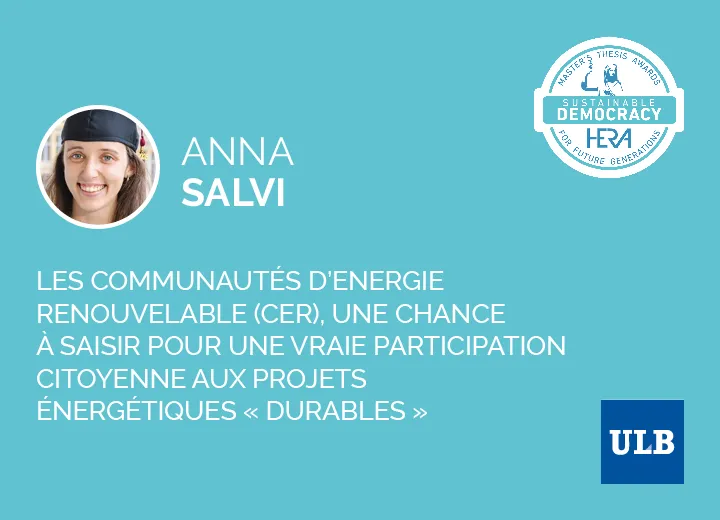 Le jury félicite Anna Salvi pour la qualité d’exécution de son travail, qui dépasse les seules questions juridiques pour aborder des enjeux « macros » de type politique ou philosophique associés à la participation citoyenne à la transition énergétique. L’approche systémique approfondie est sa plus grande force : les dimensions participative (connexions entre les quartiers, mixité), environnementale (transition énergétique), économique et sociale (inégalités socio-économiques) sont intrinsèquement liées tout au long de l’analyse. Le mémoire d’Anna se démarque également par l’innovation durable qu’elle met en évidence et qui mérite de recevoir plus d’attention du législateur et des citoyen·ne·s, car les CER (Communautés d’Énergie Renouvelable) comme nouvelle forme de participation contribuent à l’empowerment des citoyen·ne·s dans le choix de leurs sources d’approvisionnement énergétique. Pour ce faire, un travail de vulgarisation de l’analyse juridique serait le bienvenu. Par ailleurs, les questions abordées sont ancrées dans la réalité, notamment celle des logements sociaux à Saint-Gilles ou des conflits entre la Russie et l’Ukraine, et le mémoire propose des solutions pragmatiques et participatives à une problématique socio-économique et environnementale actuelle. Un lien plus étroit avec le contexte sociétal et la pratique pourrait cependant permettre d’évaluer si la communautarisation de l’énergie est réellement un instrument juste et inclusif. Le jury se pose également la question de la place des entretiens, qui ne sont pas mentionnés dans le mémoire : comment ont-ils été réalisés et mobilisés par l’autrice dans son analyse ? En lui octroyant ce prix, le jury souhaite que ce mémoire puisse concrètement nourrir la réflexion critique sur la législation en matière de démocratie (énergétique).