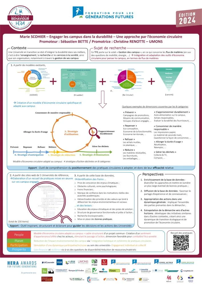Le jury souhaite saluer le mémoire de Marie Scohier pour son approche analytique utilisant différents modèles et proposant un outil utile et actionnable. En effet, son travail de fin d’études examine comment les universités peuvent promouvoir la durabilité en se concentrant spécifiquement sur la gestion des campus, en mettant l'accent sur les flux de ressources, leur dynamique et leur possible gestion durable (ex. gestion des déchets et circulation des produits). Comme délivrable, elle propose un modèle d'économie circulaire adapté aux campus, recueille des pratiques durables déjà mises en œuvre dans des universités engagées, et analyse les enseignements clés pour guider les décisions et actions visant à favoriser la durabilité sur les campus universitaires. Son mémoire a été fortement apprécié pour son analyse approfondie, qui se base sur différents modèles pour explorer les changements de comportement, ainsi que pour l’identification de pistes et outils concrets. Cependant, le mémoire se concentre sur le changement des institutions plus que sur les changements des comportements des individus (étudiant·es, professeur·es...), ce qui place le travail à la limite du champ d’application du HERA Award Sustainable Behaviour. Dans ce contexte, le jury encourage vivement les futur·e·s candidat·e·s à accorder une attention particulière à placer l’individu au centre de la notion de changement de comportement, car l’impact est crucial face aux défis sociétaux et environnementaux.