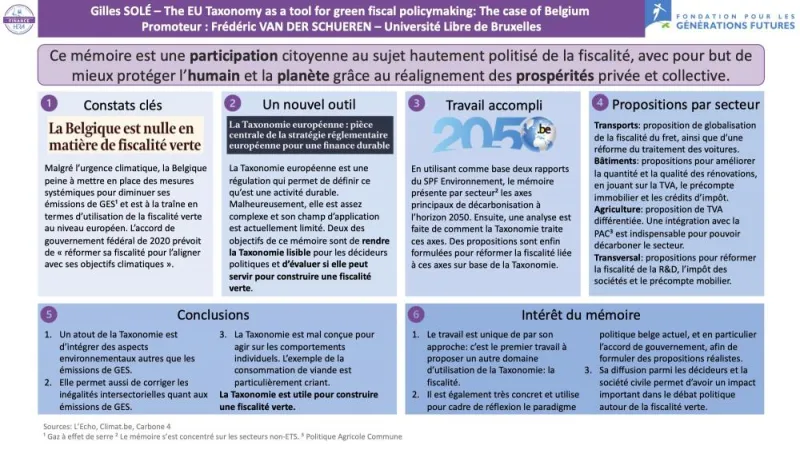 Le jury félicite Gilles Solé pour son approche de la taxonomie européenne, qu’il a traduite de façon plus ciblée, en étudiant le cas de la Belgique. Le sujet qu’il traite est plus qu’actuel et complexe : la ligne de conduite du projet de taxonomie verte vient d’être décidée par la Commission européenne dans le cadre du Green Deal et doit être transcrite pour notre pays. L’auteur a essayé de traduire les recommandations européennes, souvent vagues, pour les acteurs politiques belges. Le jury a apprécié la méthodologie qu’il a adoptée et les recommandations qu’il a formulées, a fortiori car la taxation peut représenter un moteur de changement de comportements important. Le jury salue une vraie prise de risques ! Mais que se passerait-il si la taxonomie n’était pas mise en place ? La question mériterait d’être approfondie.