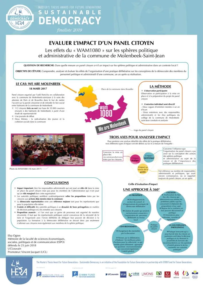 Le travail d’Elsa Ogien porte sur les remèdes à la désaffection citoyenne envers les représentants politiques et, plus précisément, sur le rôle des panels citoyens comme voie possible de réenchantement d’exercice de la démocratie. L’étudiante a travaillé sur les impacts du WAM1080 (« We are Molenbeek »), un panel citoyen qui s’est réuni à Molenbeek en mars 2017 sur le thème de la radicalisation des jeunes et de la cohésion sociale. L’originalité de son approche a consisté s’intéresser aux effets de ce panel sur les acteurs politiques et administratifs de la commune et non sur les citoyens participants. Elsa Ogien a mené des entretiens en face à face avec 11 membres du personnel politique et administratif molenbeekois. Elle a analysé non seulement l’importance du souvenir laissé par cette initiative un an après sa tenue et son impact pratique (mise en place - ou non - des recommandations émises par les citoyens), mais aussi son impact épistémique, soit l’évolution des représentations relatives à ces pratiques délibératives. L’impact du WAM1080 ayant été jugé relativement faible sur les personnes interrogées, l’étudiante formule une série de suggestions permettant de favoriser l’institutionnalisation des panels citoyens dans les pratiques politiques. Parmi celles-ci : la formation des membres de la sphère politique à la démocratie délibérative, afin de permettre une pratique plus engagée dès la mise en place de ce type de dispositifs.