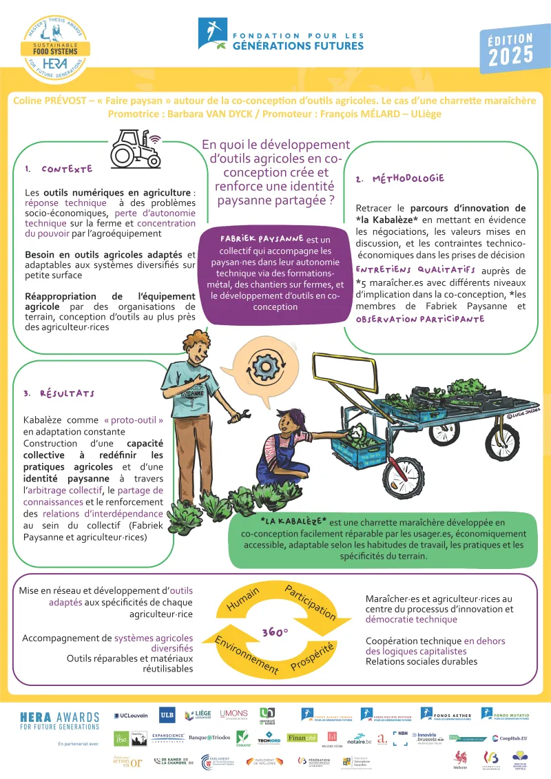 Le travail de Coline Prevost s’ancre dans le champ de l’agroécologie politique et de la sociologie des sciences et des techniques. Il part des constats que les réponses apportées aux problèmes agricoles passent souvent par un surcroît de technicité et que la souveraineté alimentaire, concept fondamental pour repenser les systèmes alimentaires, doit s’accompagner d’une réflexion sur les technologies en agriculture pour avoir plus de force. L’autrice s’est immergée dans Fabriek Paysanne, un collectif militant qui met au point des outils agroécologiques en co-conception avec les utilisateur·ices finaux·ales, c’est-à-dire qu’il les associe à chaque stade de réflexion et de fabrication de l’outil. Le choix s’est porté sur la Kabalèze, une charrette manuelle à destination des petit·es maraîcher·ères. De la conception initiale jusqu’à la production en série limitée, Coline Prévost a retracé le parcours sociotechnique de cet outil, interrogeant notamment l’origine de ses matériaux, son ergonomie, sa réparabilité, son inclusivité et son accessibilité.