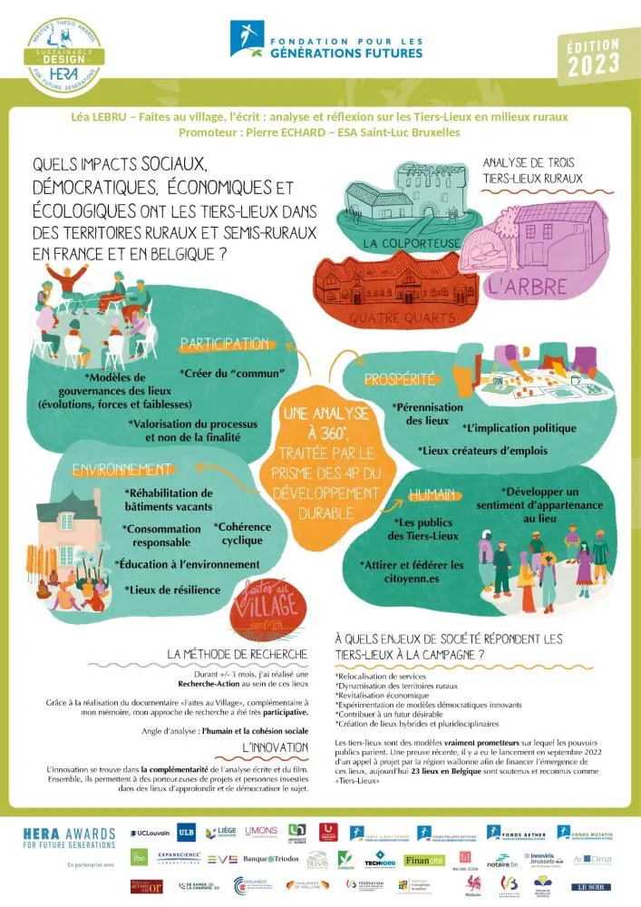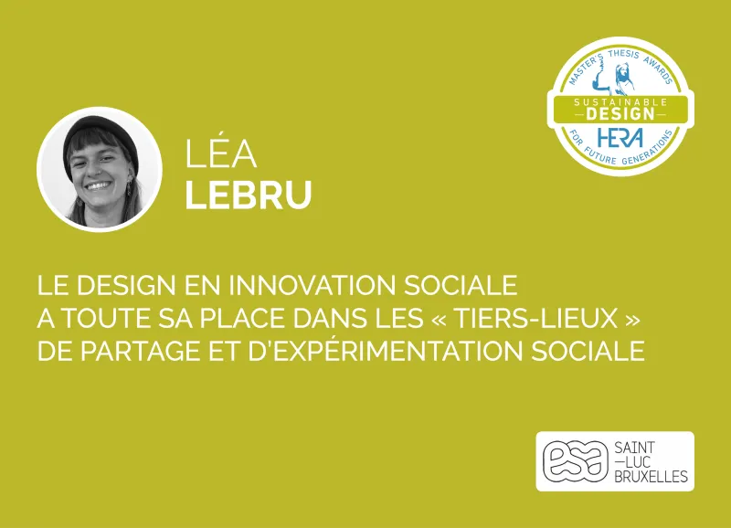 Léa Lebru s’est intéressée aux « tiers-lieux ». Il s’agit de lieux considérés comme « partagés » ou « collaboratifs » dans lesquels des individus décident de partager des expériences ou des projets locaux dans une atmosphère joyeuse, selon une organisation égalitaire et où les manières de penser et d’agir se veulent « alternatifs ». L’auteure s’est particulièrement attachée à trois tiers-lieux établis en zone rurale ou semi-rurale : Quatre quarts (Court-Saint-Etienne, Belgique), La Colporteuse (Deux-Sèvres, France) et L’Arbre Tiers-Lieu, (Calvados, France). En s’appuyant sur la méthodologie du design d’innovation sociale, son enquête de terrain, orientée « cohésion sociale », a interrogé le sentiment d’appartenance, le mode de gouvernance, l’utilisation des ressources humaines et matérielles, etc. Parmi les conclusions tirées (prolongées par un documentaire de cinéma-anthropologie), la suggestion de créer un rôle de « coordinateur·rice créatif·ve » au sein des tiers-lieux comme facteur de pérennisation de ceux-ci.