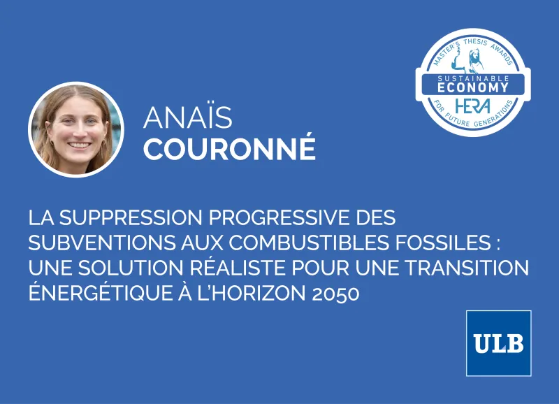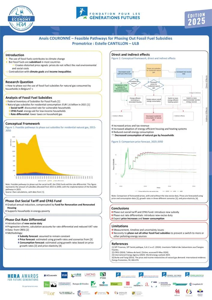 Anaïs Couronné a réalisé une analyse approfondie des subventions directes et indirectes aux combustibles fossiles en Belgique, en explorant leurs origines, leurs mécanismes et leurs impacts potentiels sur l’environnement. Elle s’est ensuite concentrée sur les subventions au gaz naturel à usage résidentiel, soit 39 % de la consommation énergétique totale des ménages, pour en proposer un plan de sortie progressive étalé sur vingt-cinq années. Celui-ci s’appuie sur la suppression progressive du tarif social (remplacé par un Fonds pour la Rénovation et le Logement Rénové) et sur un nouveau régime de droits d’accises concernant le gaz. Outre les objectifs environnementaux poursuivis, la particularité de son analyse est de porter sur une échéance de long terme qui, in fine, s’avère rentable pour les finances publiques et, surtout, de privilégier la justice sociale. Ses propositions incluent en effet des mesures concrètes d’accompagnement des ménages précaires susceptibles d’être affectés par la réforme.