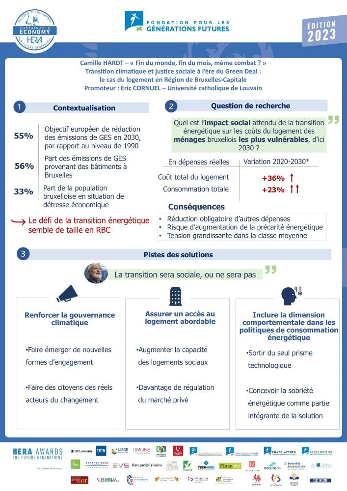 Le jury apprécie la qualité de l’état des lieux de la situation actuelle, ainsi que les projections de l’impact de la transition énergétique sur les coûts du logement bruxellois d’ici 2030. Les membres du jury soulignent les trois pistes exploratoires proposées par Camille Hardt permettant de réconcilier la transition climatique avec la justice sociale : (1) faire de la transition un processus inclusif et participatif, (2) augmenter l’offre des logements sociaux et réguler le marché privé du logement, et finalement, et (3) placer la dimension comportementale au cœur des politiques de consommation énergétique. Les juré·e·s félicitent la mémorante pour son approche à 360°, dont témoignent ces pistes.