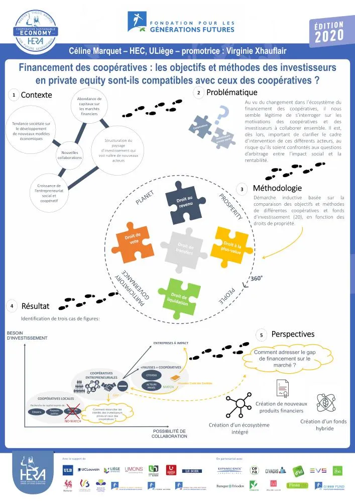 Le travail de Céline Marquet se situe dans le champ de l’impact investing et des coopératives à impact social et environnemental. L’auteure s’est penchée sur les tensions susceptibles d’intervenir entre, d’une part, les méthodes et objectifs des investisseur·euse·s institutionnel·le·s actif·ve·s dans ces structures et, d’autre part, les coopérateur·rice·s qui y sont les plus actif·ve·s. Quelle est la place, par exemple, d’investisseur·euse·s externes davantage intéressé·e·s par la valeur d’investissement à court terme que par la pérennité à long terme du projet ? Adoptant une approche inductive et qualitative, l’auteure a confronté ses lectures à ses observations (en tant que stagiaire) à la Sowecsom et aux interviews de 19 acteur·rice·s de coopératives ou de fonds d’investissement dits « à impact ». Elle en a extrait diverses suggestions d’amélioration du champ coopératif, inspirées notamment par des expériences étrangères comme la création d’un fonds hybride (Québec) ou le recours à des instruments financiers spécifiques comme le titre participatif (France).
