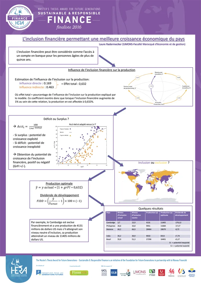 L'inclusion financière permet aux particuliers, au Nord comme au Sud, d'avoir accès à des comptes ou à des services bancaires comme l'épargne, le crédit, l'assurance, etc. Sur la base de données issues de la Banque mondiale, Laure Radermecker a construit, à l'échelle de la planète, un modèle mesurant l'impact de cette inclusion sur la croissance économique. Si certaines relations (inclusion/PIB) mises en évidence n'ont pas étonné, d'autres se sont révélées plus surprenantes. Ainsi, des pays réputés riches ou en fort développement n'en révèlent pas moins un taux d'inclusion financière peu élevé, et inversement. Des explications à cette dichotomie ont été apportées. L'étudiante a dessiné une carte mondiale affichant les pays financièrement "exclus" et "inclus". Son travail démontre que l'amélioration de l'inclusion financière d'un pays entraîne de nombreux avantages: hausse du revenu des travailleurs, meilleur développement des zones rurales, autonomie croissante des femmes, multiplication du nombre de PME, etc.