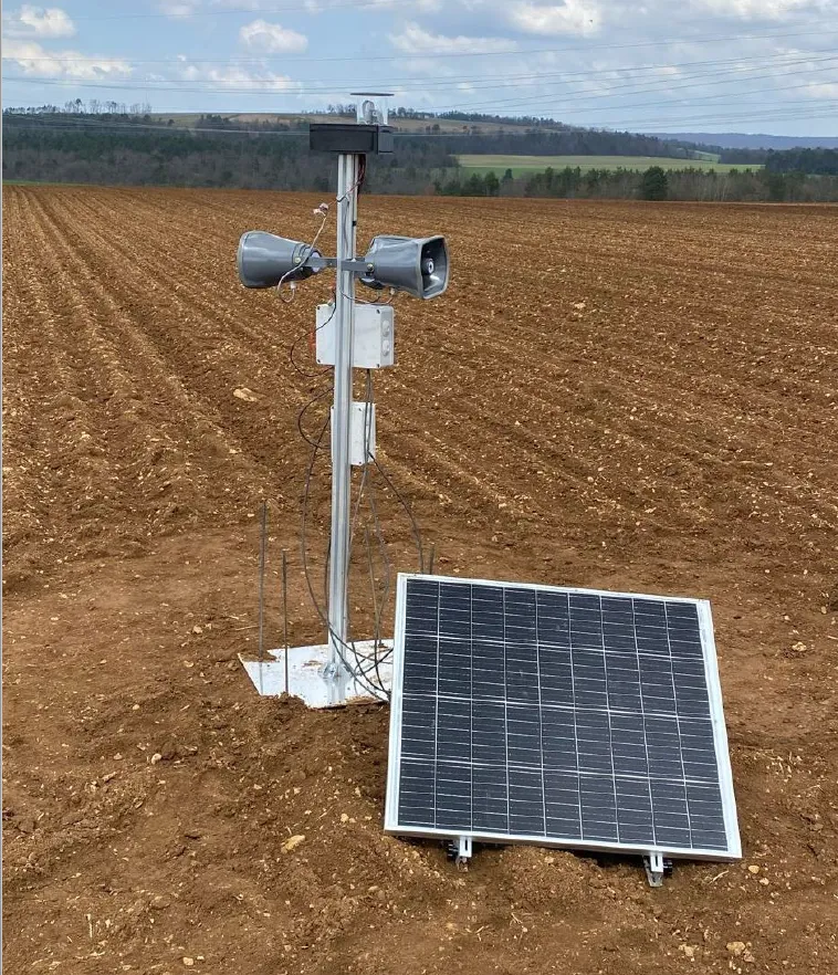 La solution proposée par Galinios est une station fixe et autonome, déployée dans les champs, qui détecte les oiseaux et émet des signaux sonores adaptés pour les repousser. Le dispositif est capable de surveiller jusqu’à 3ha de cultures. Il informe l’agriculteur·rice en temps réel des menaces sur son champ et le·la tient informé·e de la situation. L’effarouchement sonore est automatiquement déclenché. Les sons qui en sont diffusés ont été déterminés par un algorithme développé par Galinios. Contrairement aux solutions existantes, l’effarouchement s’actionne uniquement en cas d’attaque d’oiseaux pour limiter l’accoutumance et les nuisances sonores.