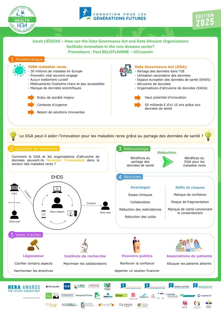 Dans son mémoire, Sarah Liégeois analyse l’impact positif potentiel du Data Governance Act (DGA), en particulier à travers le concept de Data Altruism, sur la recherche et l’innovation dans le secteur des maladies rares. Le DGA est un instrument législatif de la Commission européenne, entré en vigueur en 2023. Il définit un cadre juridique pour autoriser et faciliter le partage des données, dont les données de santé.