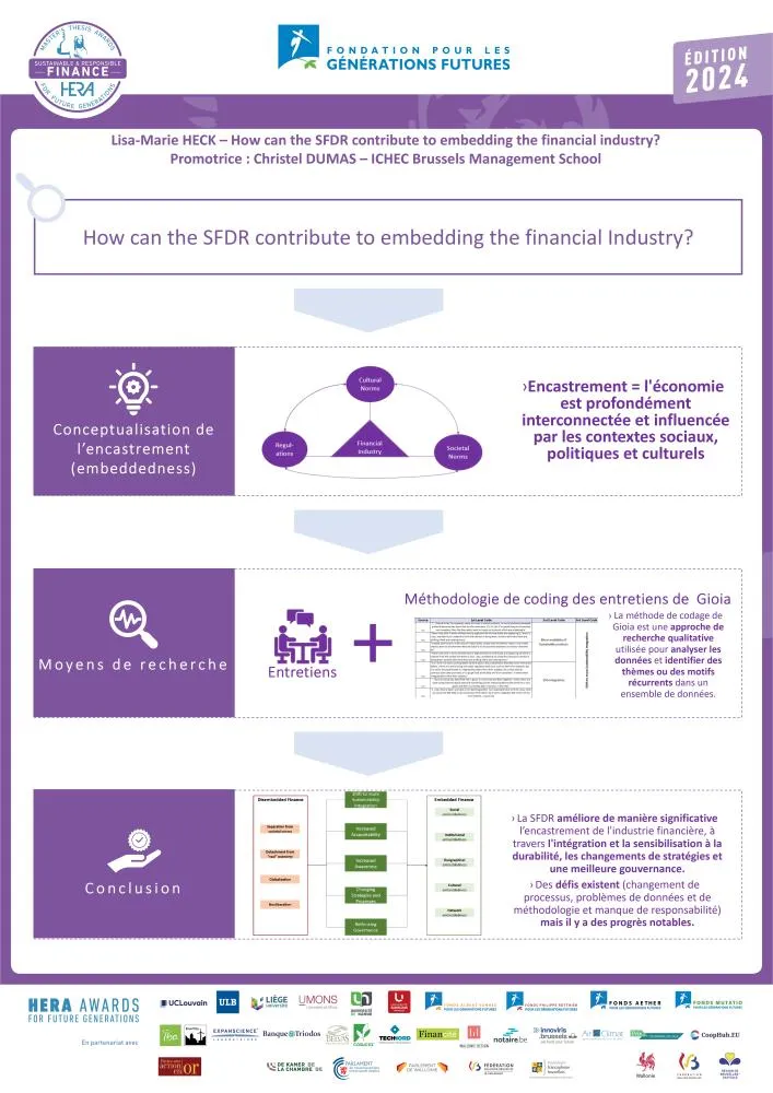 En application depuis mars 2021 (et, ensuite, selon différents paliers), la réglementation européenne « SFDR » (Sustainable Finance Disclosure Regulation) a pour objectif d’améliorer la transparence du secteur financier au regard des objectifs de développement durable de l’Union européenne. Elle est, en ce sens, un puissant outil potentiel contre le greenwashing. Le travail de Lisa-Marie Heck a pour particularité d’explorer l’impact du SFDR sur le secteur financier à partir du concept d’encastrement, défini par l’économiste et sociologue hongrois Karl Polanyi. Lisa-Marie Heck a d’abord défini ce concept et ceux des critères ESG (Environmental, Social and Governance). À partir d’une douzaine d’entretiens semi-directifs menés auprès d’acteur·rices clés du secteur de la finance durable (particulièrement des auditeur·rices SFDR), elle a ensuite mené une analyse approfondie de la réglementation en question : ses objectifs, ses impacts (notamment sur le marché), ses enjeux, ses faiblesses…