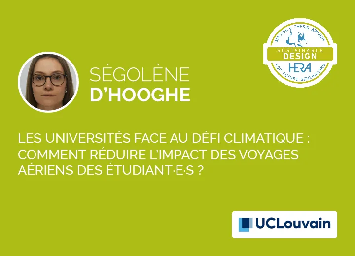 Le jury félicite Ségolène D’Hooghe pour son mémoire qu’il estime particulièrement mobilisateur sur la question des impacts environnementaux du transport aérien, qu’elle aborde à travers le prisme des voyages estudiantins effectués dans le cadre du programme Erasmus. L’enjeu est expliqué de manière convaincante : la mise en parallèle de la pollution causée par l’aviation avec l’ambition légitime de la mobilité étudiante (ouverture sur le monde, création de liens entre les étudiant·e·s, échanges internationaux entre universités), traduit les paradoxes auxquels nous confronte la transition écologique. Il nous rappelle l’importance de nous poser la question de notre impact dans les petits gestes du quotidien. Le jury a beaucoup aimé l’engagement palpable de Ségolène dans son sujet d’étude, qui la concerne directement et qu’elle a traité sous tous les angles (social, environnemental, économique). Le calcul de l’empreinte carbone et la visualisation claire des trajets étudiés l’ont aussi convaincu. La solution que Ségolène designe, l’«Erasmus bus», est intéressante à plusieurs niveaux : simple, implémentable dès demain, créatrice de liens entre les étudiant·e·s (sur le même principe que les voyages au ski) ; elle responsabilise les institutions (via la prise en compte plus globale de l’impact environnemental des universités dans leurs projets) et pas uniquement les individus (étudiant·e·s) ; elle encourage aussi les partenariats non seulement économiques (avec des plateformes comme Blablacar ou Flixbus), mais également institutionnels (entre universités européennes). Le jury perçoit beaucoup de potentiel dans ce mémoire et dans ce projet, qu’il serait intéressant de voir aboutir à une échelle européenne.