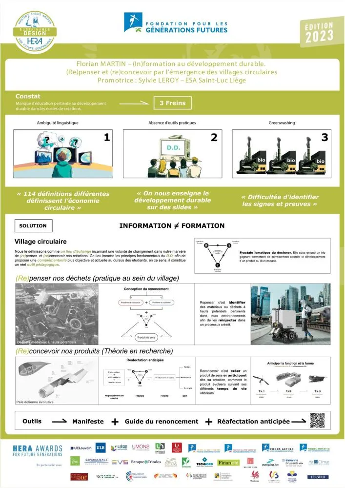 Le travail de Florian Martin part du constat que le système éducatif dans son ensemble, singulièrement dans le secteur du design et des arts, manque d’outils pédagogiques permettant de réduire l’utilisation de matières premières et de s’engager vers la décroissance. Grâce à une série de rencontres et d’événements spécifiques étalés sur trois années, des passerelles ont été établies entre les différentes sections de l’ESA Saint-Luc Liège (design industriel, architecture intérieure, peinture, communication visuelle et graphique) et la faculté d’architecture de l’ULiège afin d’aboutir à la création d’un « village circulaire ». À la fois virtuel et physique, autogéré par les étudiants, ce village est un lieu d’échanges et de réalisations concrètes axé sur l’écoconception, le caractère passif des constructions, la soutenabilité des créations de l’école mais aussi la façon dont les étudiant·e·s s’alimentent pendant leur cursus. Les maîtres mots y sont réparation, entretien, échange et réutilisation. Ses points forts ont été rassemblés dans un manifeste et divers outils susceptibles d’enrichir le modèle des récupérathèques.