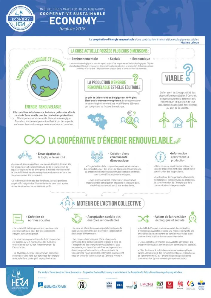 Les coopératives d'énergie renouvelable ne cessent de se multiplier en Belgique, comptant toujours davantage de membres. Maxime Lebrun a voulu savoir si ces coopératives sont de nature à corriger les défauts des structures classiques de production d'énergie renouvelable (position dominante de quelques firmes, manque de confiance du consommateur, informations peu disponibles, etc.). Il a d'abord dressé un inventaire des valeurs et principes des coopératives en question. Il a ensuite donné un aperçu des différentes coopératives présentes en Belgique. L'originalité de son approche est d'avoir questionné ces structures sous un regard économique pluriel, tout en utilisant également l'apport des sciences sociales. Son travail révèle l'importance du capital social (confiance des coopérateurs, sentiment d'appartenance à une communauté et engagement dans l'action collective) dans l'adoption et l'acceptabilité des énergies renouvelables. Il présente les coopératives comme des modèles hybrides d'organisation qui parviennent à créer une jonction entre la logique de marché et l'intérêt général. En dépit de certains dangers (érosion de l'esprit coopératif, etc.) et limites (législations inadaptées, etc.), il estime que ces coopératives permettent de mieux répartir les ressources tant naturelles que monétaires et promeuvent par ailleurs une autonomie accrue des individus.