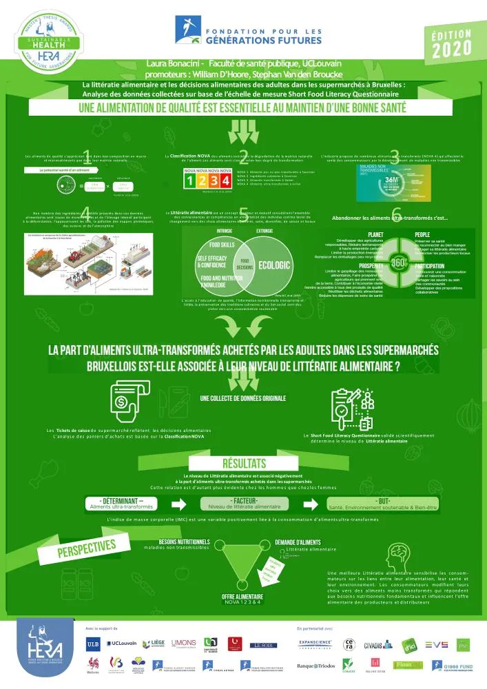 La consommation d’aliments ultra-transformés constitue un facteur clé de la pandémie d’obésité à travers le monde. Les ingrédients utilisés (additifs, sucres raffinés, graisses et sels controversés) sont souvent méconnus des consommateur·rice·s. Leurs emballages sont peu recyclables et leur degré de conservation est faible. Laura Bonacini a cherché à savoir si le degré de littératie alimentaire des ménages bruxellois clients des supermarchés est lié à leurs achats relatifs à ce genre d’aliments. La littératie alimentaire recouvre les notions d’accès aux informations de qualité, la transparence et la lisibilité de l’information nutritionnelle, la préservation des traditions culinaires et du lien social via l’élaboration des repas. L’auteure a soumis 332 client·e·s d’enseignes bruxelloises à un questionnaire spécifiquement habilité à mesurer leur niveau de littératie alimentaire. Elle a établi, puis commenté, la relation faiblement positive du niveau de littératie alimentaire à la qualité des paniers alimentaires des répondant·e·s.