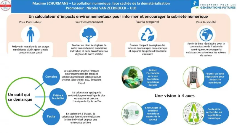 Si le système numérique mondial était un pays, il serait le troisième plus grand consommateur d’électricité au monde derrière la Chine et les États-Unis. Partant de ce constat (et de celui des limites des calculateurs d’impacts environnementaux actuels : imprécision, greenwashing….), Maxime Schurmans a établi les bases théoriques d’un calculateur innovant. Reposant sur la méthodologie de l’analyse de cycle de vie, celui-ci analyserait les impacts environnementaux de tout outil numérique depuis sa fabrication jusqu’à sa fin de vie. Conçu dans le but de sensibiliser le grand public sur sa consommation réelle d’électricité via PC et smartphone, il permettrait à chacun·e d’évaluer l’empreinte environnementale de son comportement numérique selon six critères : position géographique, type d’appareil et de connexion, action numérique prestée, recyclage (ou non), nombre d’années d’utilisation. Maxime Schurmans a également étudié en détail les pratiques des GAFAM et l’impact réel de leur colonne vertébrale : les centres de données.