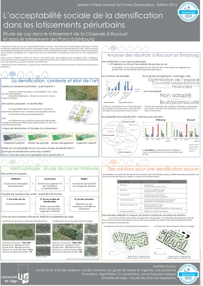 « Avec son mémoire, madame Dumas explore les limites psychologiques des citoyens et des communes par rapport à la thématique de la densification de l’habitat. En mettant en parallèle les avis des citoyens et des échevins, elle arrive à des solutions innovantes et crédibles, car acceptables. Plus que dans les solutions architecturales, la grande plus-value de son travail réside en la mise en lumière de l’évolution des mentalités. »