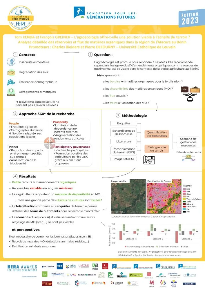 François Greiner et Tom Kenda se sont concentrés sur un des aspects clés de la pratique agroécologique : la disponibilité de ressources organiques de qualité en quantités suffisantes à l’échelle locale. Leur travail a consisté à quantifier les ressources organiques potentiellement valorisables pour l’agriculture « à taille humaine » pratiquée dans six villages situés dans le département de l’Atacora, au Bénin. Outre la littérature, les outils mobilisés ont consisté en une cartographie satellitaire de l’occupation des sols et en mesures de biomasse végétale sur le terrain (cultures, plantes herbacées et ligneuses), mais aussi en une enquête menée directement auprès des producteur·rice·s et éleveur·euse·s concerné·e·s. Avec la participation de ces dernier·e·s, divers scénarios de limitation ou de suppression des engrais minéraux ont été élaborés et critiqués (atouts/obstacles), basés sur des modifications dans les pratiques actuelles : recours à une fertilisation minérale raisonnée et à davantage de légumineuses, restitution maximale des déjections animales vers les champs et bonne gestion des résidus de cultures.