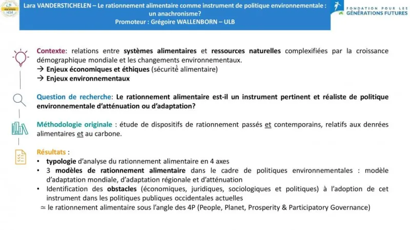 l’urgence environnementale, sociale et climatique. Dans ce travail, l’auteure intègre de manière transversale les notions d’environnement, d’éthique, d’égalité et de participation, ce qui lui permet de déployer le rationnement alimentaire comme étant un nouvel outil pour construire un monde plus juste, et non comme outil de privation de liberté. Elle développe notamment cette approche autour d’enjeux tels que la lutte contre le gaspillage ou l’égalité entre les pays du Nord et du Sud.