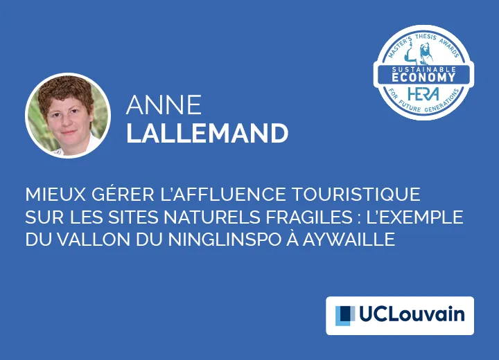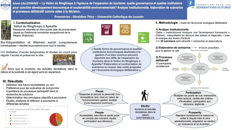 Le travail d’Anne Lallemand porte le Ninglinspo, un vallon forestier à haute valeur hydro(géo)logique situé à Aywaille et soumis à la sur-fréquentation touristique. L’auteure a identifié des solutions innovantes et robustes en termes de gouvernance, aptes à rendre compte de motivations plus larges (éthiques, notamment) que dans les processus décisionnels traditionnels. Pour ce faire, elle a mobilisé le cadre conceptuel d’Elinor Ostrom (Institutionnal Analysis and Development framework) sur les ressources dites « communes ». Elle a utilisé plusieurs méthodes participatives : élaboration de scenarios, discussion en focus group, entretiens semi-directifs avec quatre types d’acteur·trice·s (décideur·euse·s, régulateur·rice·s, utilisateur·rice·s et impacté·e·s, auxquels elle a ajouté deux « tiers absents » : la Nature et les générations futures), etc. Les solutions suggérées sont susceptibles de concerner des sites touristiques de plus grande ampleur.