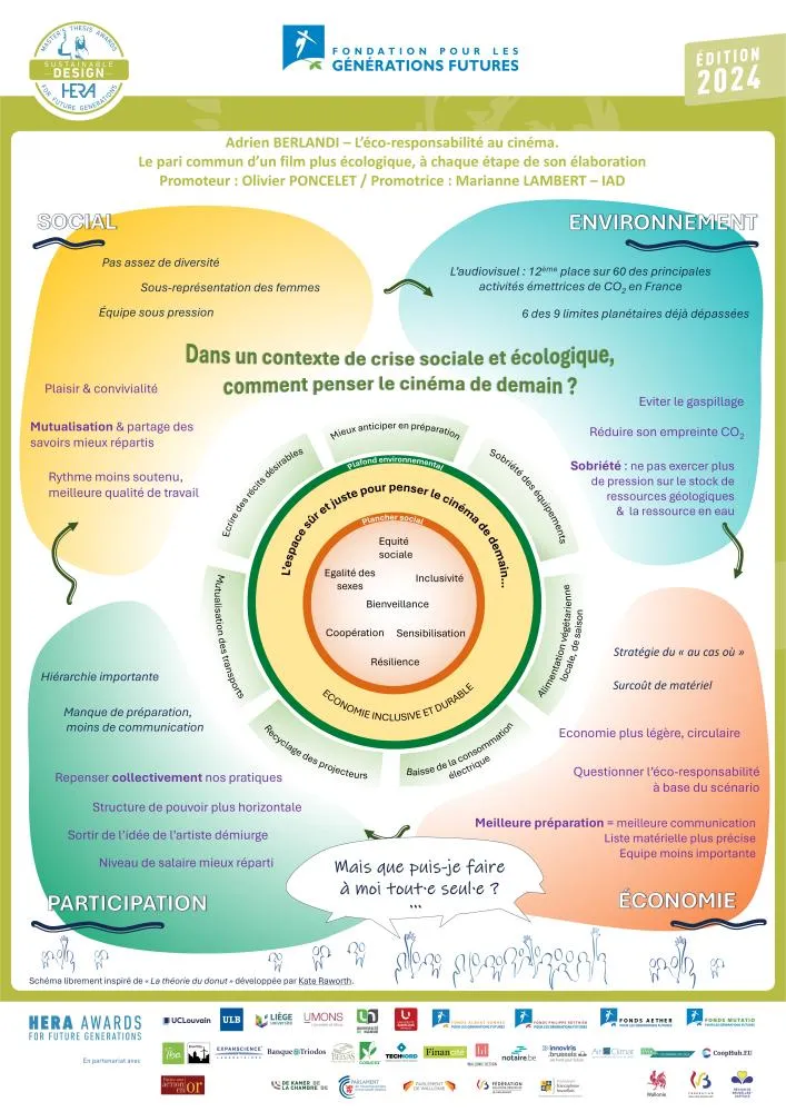 Le travail d’Adrien Berlandi a été un animement salué par le jury en mettant en lumière une problématique dont on entend très peu parler alors que les chiffres sont effarants : l’impact environnemental et socialde l’industrie audiovisuelle est colossal et ce mémoire pousse à s’extraire de notre posture de simple spectateur·ice pour considérer l’ensemble de la chaîne de valeur du cinéma et l’envers de son décor de rêve.Truffé d’anecdotes et agréable à lire, le mémoire d’Adrien se présente surtout comme un très bon outil technique pour réaliser un film plus écologique, étape par étape (lumière, régie, etc.). Une attention particulière est portée à la dimension participative du processus de réalisation cinématographique, qu’Adrien pose d’entrée sur la couverture de son travail (« Et qu’est-ce que je peux faire à moi tout seul ? ») : au cours de sa recherche, il se rend compte que permettre à tou·te·s les acteur·ice·s de la chaîne de participer à la réalisation du film et imposer certaines contraintes « écologiques » contribuent à réduire les pratiques nocives tout en stimulant la créativité. Le jury a réellement été séduit par ce mémoire atypique et innovant par sa thématique. Il félicite Adrien de porter l’étendard de l’écologie et de la justice sociale dans sa profession. Le jury souhaite, à travers ce prix, encourager Adrien à poursuivre dans cette voie et envoyer un message plus politique. Son travailpeut avoir un effet levier s’il réussit à conscientiser et à fédérer le secteur autour de ses propositions. Le jury y voit même se dessiner le profil d’un métier à inventer, celui d’écoconcepteur·ice de film.