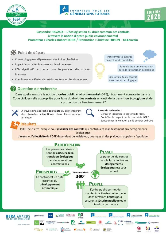 Le jury adresse toutes ses félicitations à Cassandre Havaux pour l’originalité de son mémoire, dans lequel elle examine comment le droit des contrats peut jouer un rôle déterminant dans la transition écologique, en ce qu’il intègre désormais (depuis la réforme récente du Code Civil) la notion d’ordre public environnemental.