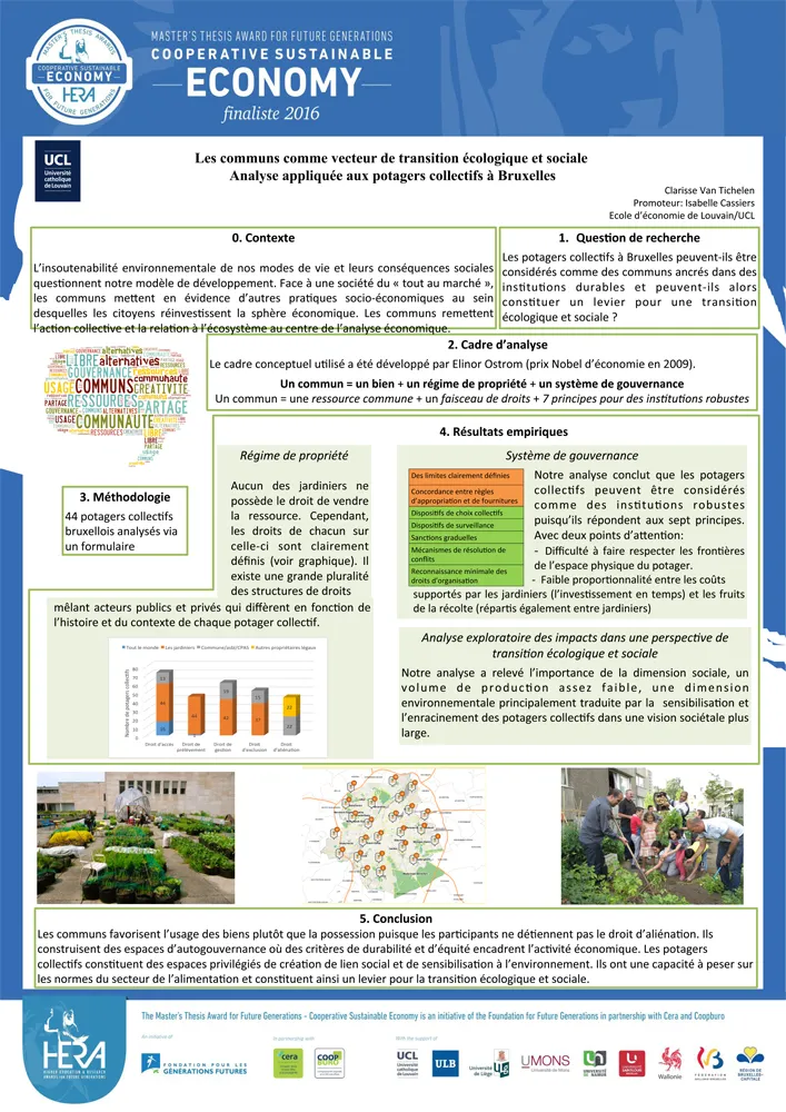 Les potagers urbains, en Belgique, sont en plein essor. La Région bruxelloise en compte près de 200. Parallèlement, la notion de "communs", proposée par Elinor Ostrom (prix Nobel d'économie, 2009), s'est considérablement développée ces dernières années. Elle désigne une série de pratiques dont le mode de gouvernance ne ressemble ni à l’État, ni aux règles du marché. Clarisse Van Tichelen a voulu savoir si, à la lueur de cette notion, les potagers collectifs s'avèrent des outils efficaces vers une transition sociale et écologique. Le mode de gestion de 42 potagers a été analysé. Il en résulte que ceux-ci constituent des institutions durables et robustes au sens d'Ostrom, leurs impacts sociaux (notamment) étant loin d'être négligeables. Leur capacité en termes de volume de production, en revanche, reste faible, tout comme leur potentiel de transformation économique. L'apport le plus important des potagers est de peser sur les normes: ils montrent, quotidiennement, que des alternatives durables sont réalisables et souhaitables.