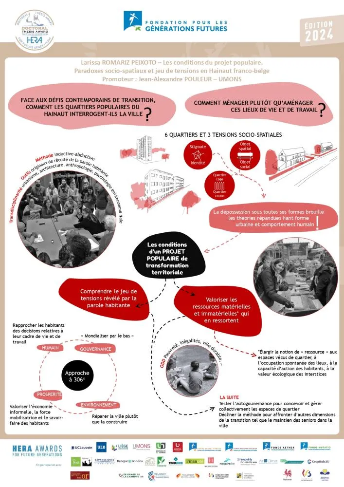 Le jury a été séduit par la thèse de Larissa Romariz Peixoto qui propose une excellente lecture des tensions etparadoxes socio-spatiaux à l’épreuve de projets urbains dans les quartiers populaires. Dans sa thèse, l’autrice tente de comprendre les mécanismes complexes qui sous-tendent la mise en œuvre – et a fortiori les chances d’aboutissement et de succès – de projets urbains et urbanistiques dans les quartiers populaires. Elle montre comment ces derniers, alors même qu’ils visent une meilleure intégration sociale des habitant·e·s, exacerbent souvent les violences sociales, psychologiques et spatiales déjà installées dans ces quartiers. Le jury a particulièrement apprécié l’approche résolument systémique et participative adoptée dans la thèse. Celle-ci permet d’adresser avec beaucoup de pertinence et d’efficacité la problématique des inégalités sociales et territoriales provoquées d’une part par les formes urbanistiques héritées du passé et d’autre part par les politiques d’insertion urbaine et sociale en vigueur. A travers un impressionnant travail de terrain, l’autrice dépasse les visions d’expert·e·s et identifie les conditions d’émergence d’un réel projet populaire. Dans ce contexte, elle déstigmatise la voix des habitant·e·s et leur redonne pleinement le pouvoir et la légitimité de s’exprimer sur leur lieu de vie, d’en imaginer l’avenir et de prendre des décisions le concernant. A cette fin, l’autrice propose des outils intéressants pour favoriser la participation citoyenne, faciliter les échanges et la co-construction d’un projet commun mettant au cœur de son fonctionnement les principes de gouvernance participative. Elle parvient de la sorte à faire émerger du terrain (approche « bottom-up ») des pistes de solutions pour une transition réellement durable des quartiers populaires, aux niveaux environnemental, économique et social. Le jury regrette toutefois que sur les six quartiers étudiés, seuls deux quartiers se situent en Wallonie, et par ailleurs dans la même province, et aurait souhaité que les enseignements des expériences puissent faire l’objet de plus de généralisation. Par ailleurs, le jury souligne les capacités de vulgarisation de l’autrice ainsi que la qualité graphique de la thèse qui facilite grandement la transmission du message. Le jury se montre très enthousiaste à la lecture des propositions de valorisation qui envisage de développer le projet et encourage vivement la concrétisation de celles-ci (par ex. l’application du projet populaire à des thématiques comme la transition écologique ou les services liés au soin, à la santé mentale et physique).