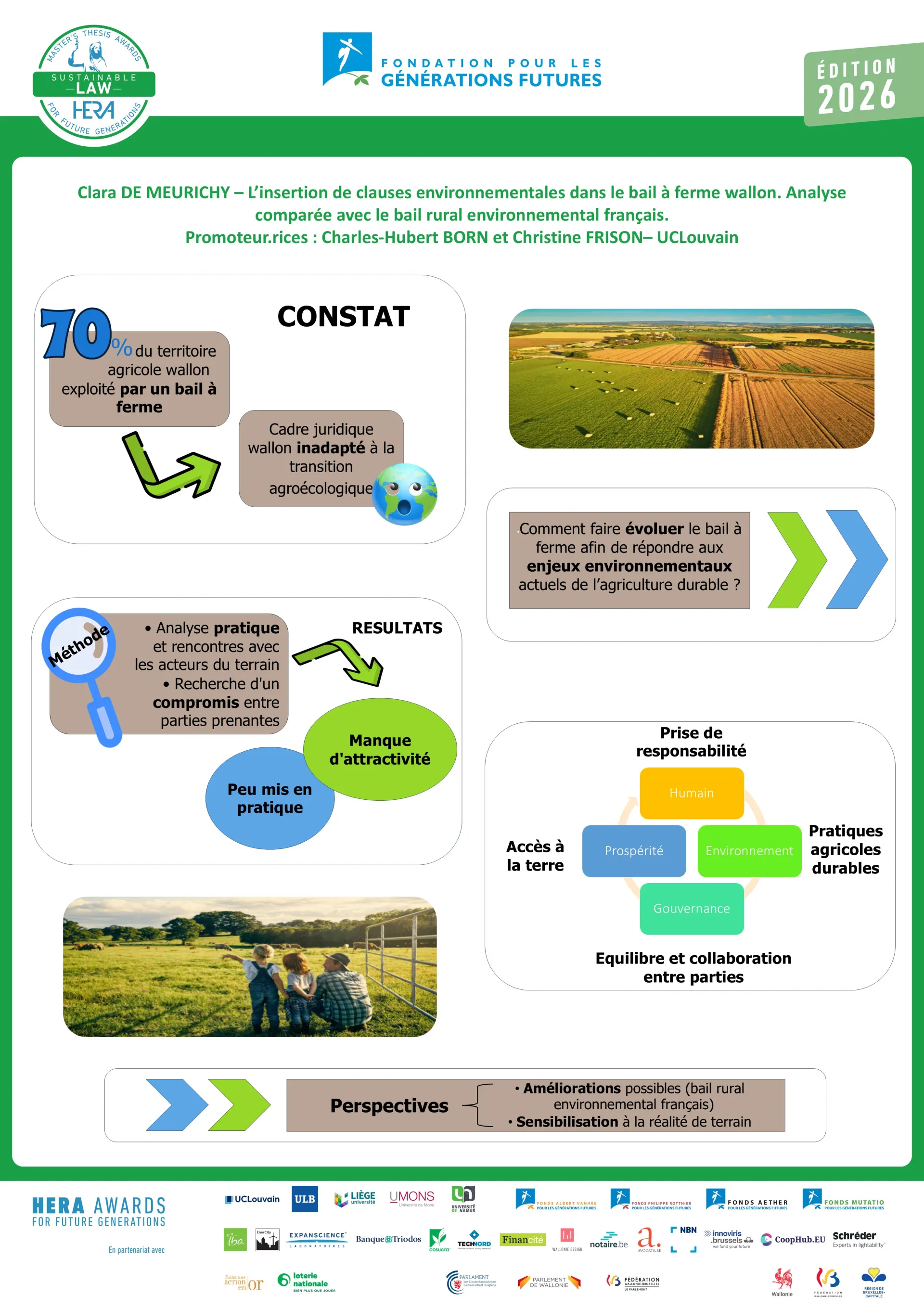 Le jury salue la qualité du travail de terrain réalisé. Les entretiens menés auprès d'acteur·rices clés du secteur enrichissent le mémoire et témoignent d'une bonne compréhension des réalités agricoles wallonnes. Le jury apprécie également la comparaison avec le bail rural français, qui apporte une réelle valeur ajoutée et peut servir d'inspiration pour faire évoluer le cadre wallon. Le jury souligne enfin la pertinence de ce mémoire pour la pratique notariale, dimension qu'il apprécie particulièrement.