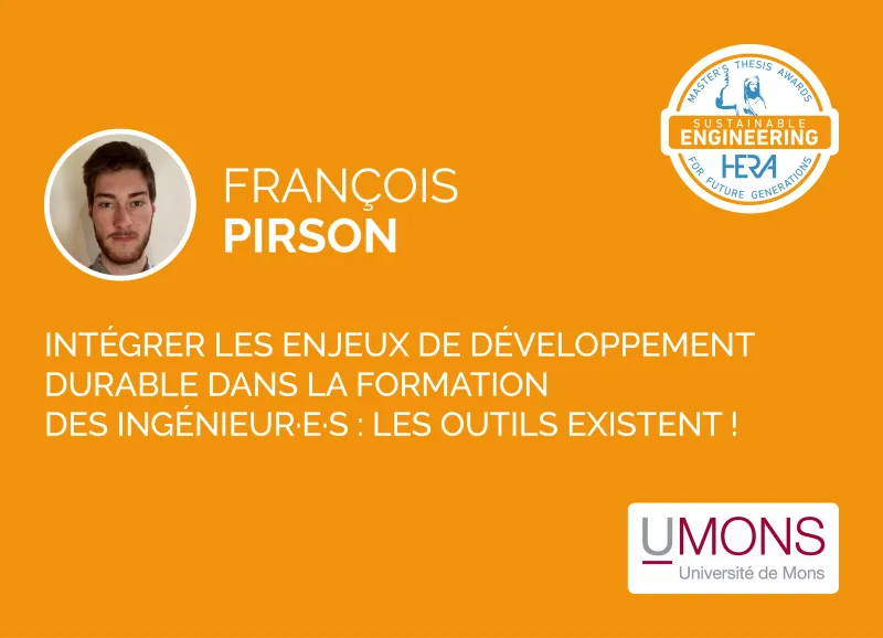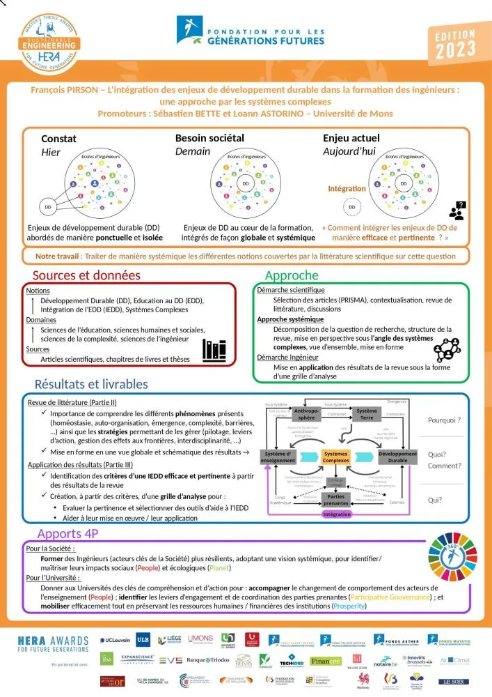 Le travail de François Pirson part du constat que l’éducation au développement durable (EDD) est insuffisamment intégrée au sein des cursus de l’enseignement supérieur dans son ensemble, particulièrement dans celui des ingénieur·e·s. Il a réalisé une revue de la littérature dont il a modélisé les résultats selon une méthodologie de systèmes complexes. Ces résultats lui ont permis d’élaborer une grille d’analyse identifiant des critères à respecter lors de la mise en œuvre d’un processus d’intégration de l’EDD. À titre d’illustration, il a appliqué cet outil au rapport ClimatSup INSA : former l’ingénieur au XXIème siècle de The Shift Project. Son travail prône un changement de paradigme, susceptible de se décliner dans différents leviers concrets : ouverture de la communauté académique à des intervenant·e·s externes, empowerment de ces parties prenantes, création d’un comité de pilotage, etc. Son travail s’adresse prioritairement aux équipes de direction des universités.