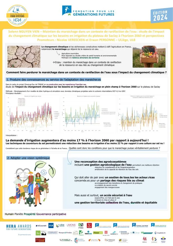 Le mémoire de Solenn Nguyen Vien se concentre sur la préservation du maraîchage en France face à la raréfaction de l'eau due aux changements climatiques. En utilisant un modèle développé lors d'un stage pour le projet ClimaLeg-Eau de l'INRAE, l'auteure estime l'impact climatique sur les besoins d'irrigation du maraîchage, mettant en évidence une augmentation significative d'ici 2060. Le mémoire préconise des solutions, notamment une adaptation agroécologique, le partage des risques climatiques, l'engagement de tous les acteurs concernés, et une gestion de l'eau territorialisée, équitable et durable.Les membres du jury souhaitent mettre en lumière le mémoire de Solenn, car il aborde avec pertinence et innovation cette problématique qui touche à différents enjeux majeurs, comme la gouvernance et la gestion de l’eau, la transition des fermes vers l’agroécologie,etc..Ils saluent l'application pratique du modèle développé lors du stage et reconnaissent l’approche innovante du sujet, notamment grâce aux modélisations, sur base des données issues des projections climatiques par le GIEC, montrant l’évolution des ressources en eaux et permettant de développer plusieurs scénarii (en fonction des cultures, la couverture du sol ...). Le jury souligne l'importance de ce travail dans le contexte des en jeux agricoles contemporains et encourage les futur·es mémorant·es à poursuivre la recherche pour étudier l'applicabilité dans les fermes en tenant compte de l'avis des maraîcher·es et pour développer davantage certaines techniques proposées, telles que les méthodes de réduction du ruissellement.